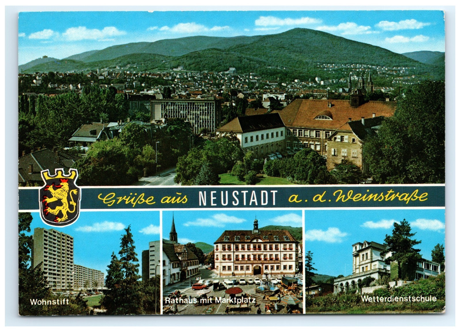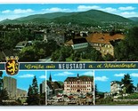This original vintage lithograph postcard features scenic views of Neustadt an der Weinstraße, a historic town in Germany's wine region. The card includes a panoramic cityscape with lush green hills in the background, alongside three smaller images showcasing notable landmarks: Wohnstift residential complex, the Rathaus (town hall) with its bustling marketplace, and the Wetterdienstschule meteorological school. The vibrant chrome finish enhances the rich colors and fine details, capturing the charm and architectural heritage of mid-20th century Neustadt.