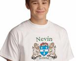 Product description: Nevin Irish Coat of Arms Tee Shirt in White. Every Irish family has a story to tell, probably hundreds of stories. Your Irish coat of arms is a visual record of your family's oldest, most significant stories. Here, they're told in bright, permanent artwork on these fine-quality, 100% cotton Gildan tee shirts. Over 25 years of heraldry research and over 1000 available Irish family coat of arms.