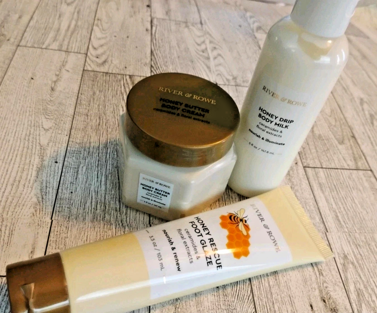 - NEW 3PCS! RIVER & ROWE HONEY RESCUE FOOT GLAZE, BUTTER BODY CREAM & BODY MILK