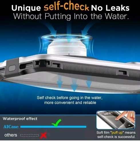 It has unique self-checking feature so you can ensure waterproof without putting into the water, there is a water proof check pump at the back of the case, this pump works by putting a bit of pressure inside the case to "puff up" the front of the case so you can get a visual of the air trapped inside, gives a strong piece of mind that the case is airtight before you actually go into the water