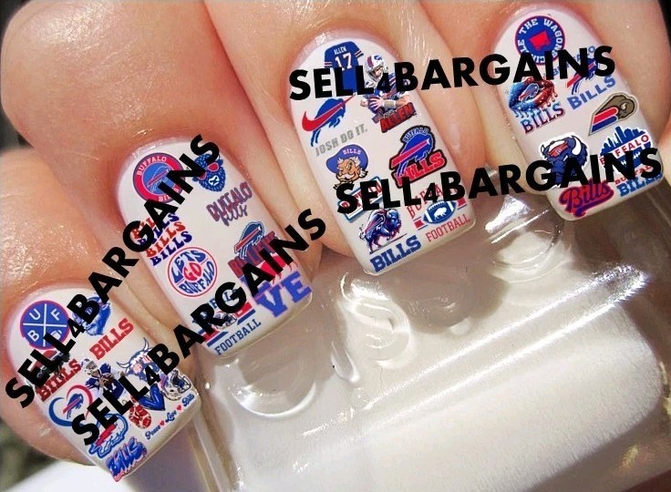 This is a listing for 68 Buffalo Bills salon quality promo nail decals with clear transfer graphic art nail designs as pictured. The decals are bigger than pictured.
