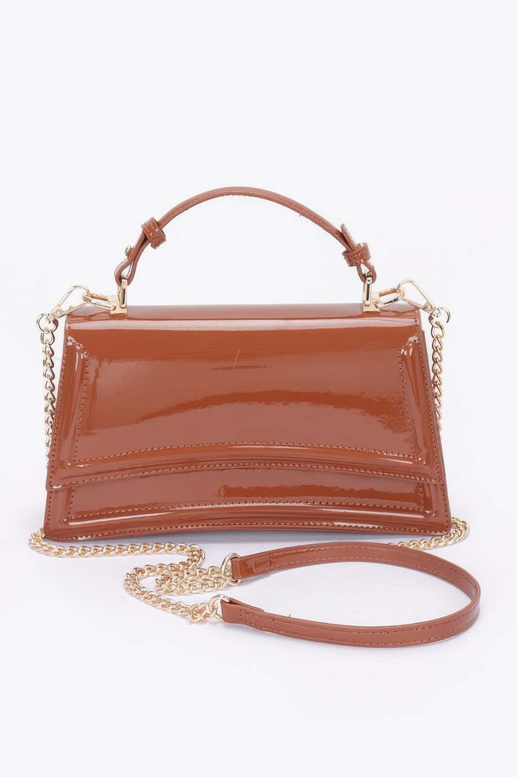 Introducing the Enamel Top Handle Flap Bag, a sleek and sophisticated accessory designed to elevate your style. Crafted with a smooth enamel finish and featuring a stylish top handle, this bag offers both elegance and practicality. The chic, mixed metal accents add a modern touch, making it perfect for a variety of occasions.