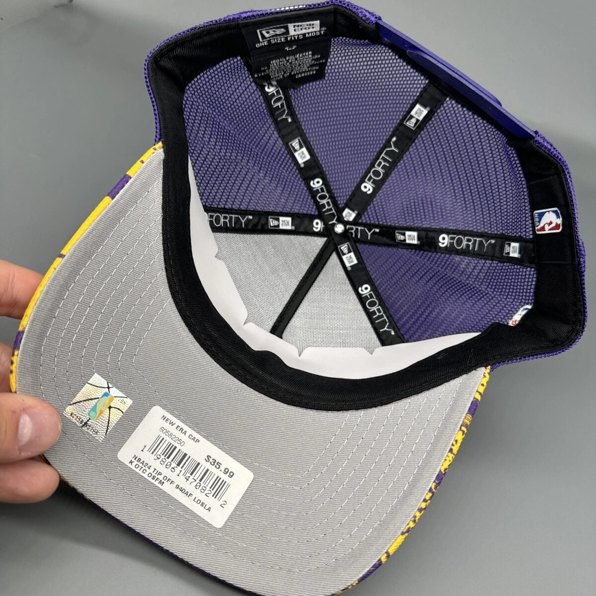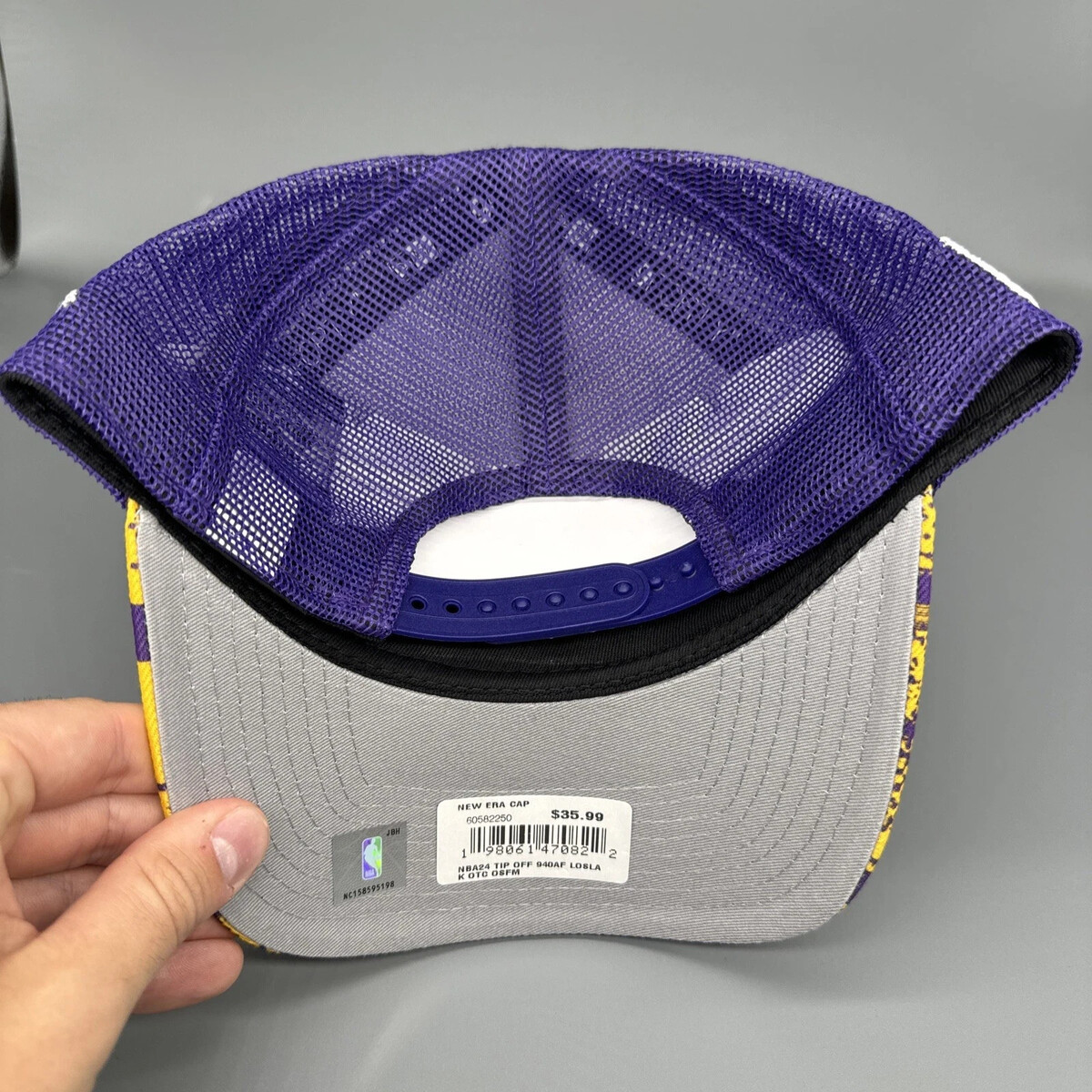 The New Era 9FORTY A-Frame Los Angeles Lakers Tip Off Trucker Purple/Yellow Hat Cap is an officially licensed cap designed for male fans of the Los Angeles Lakers. This stylish hat features the iconic team colors of purple and yellow, making it a perfect accessory for game days or casual outings. Made with high-quality materials, this cap is a must-have for any basketball fan looking to show their team spirit in style.