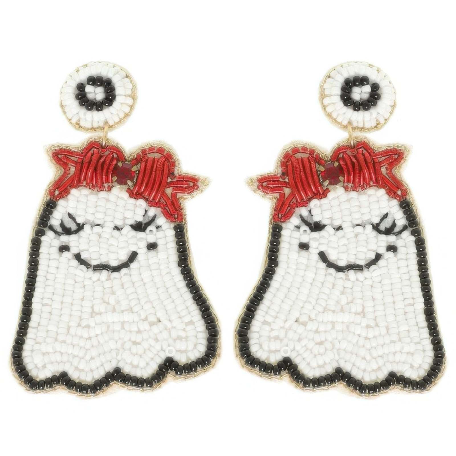 Sweet meets spooky in the Halloween Ghost with Red Bow Seed Beaded Post Earrings. Featuring a playful ghost motif adorned with a bright red bow, this design is hand-detailed with colorful seed beads and sparkling crystal accents. Lightweight and comfortable, they add a festive finishing touch to your Halloween ensembles, from casual outfits to full costumes.