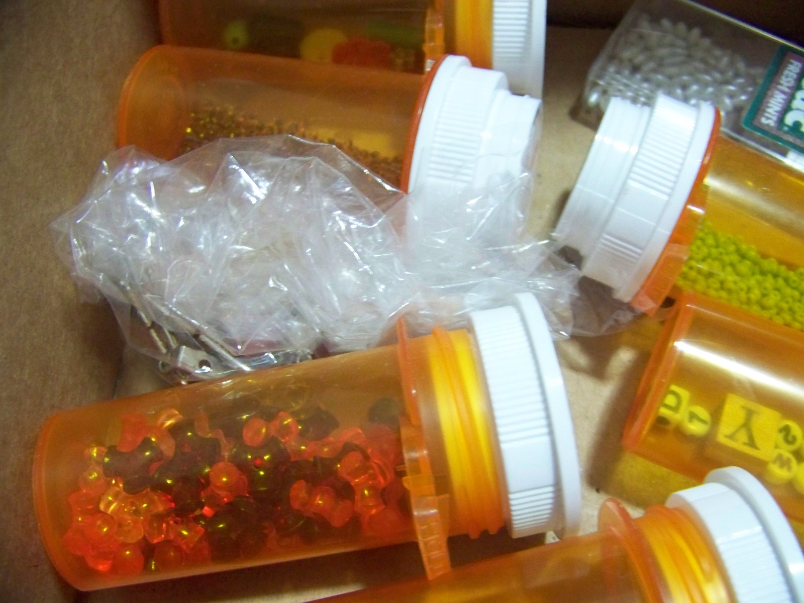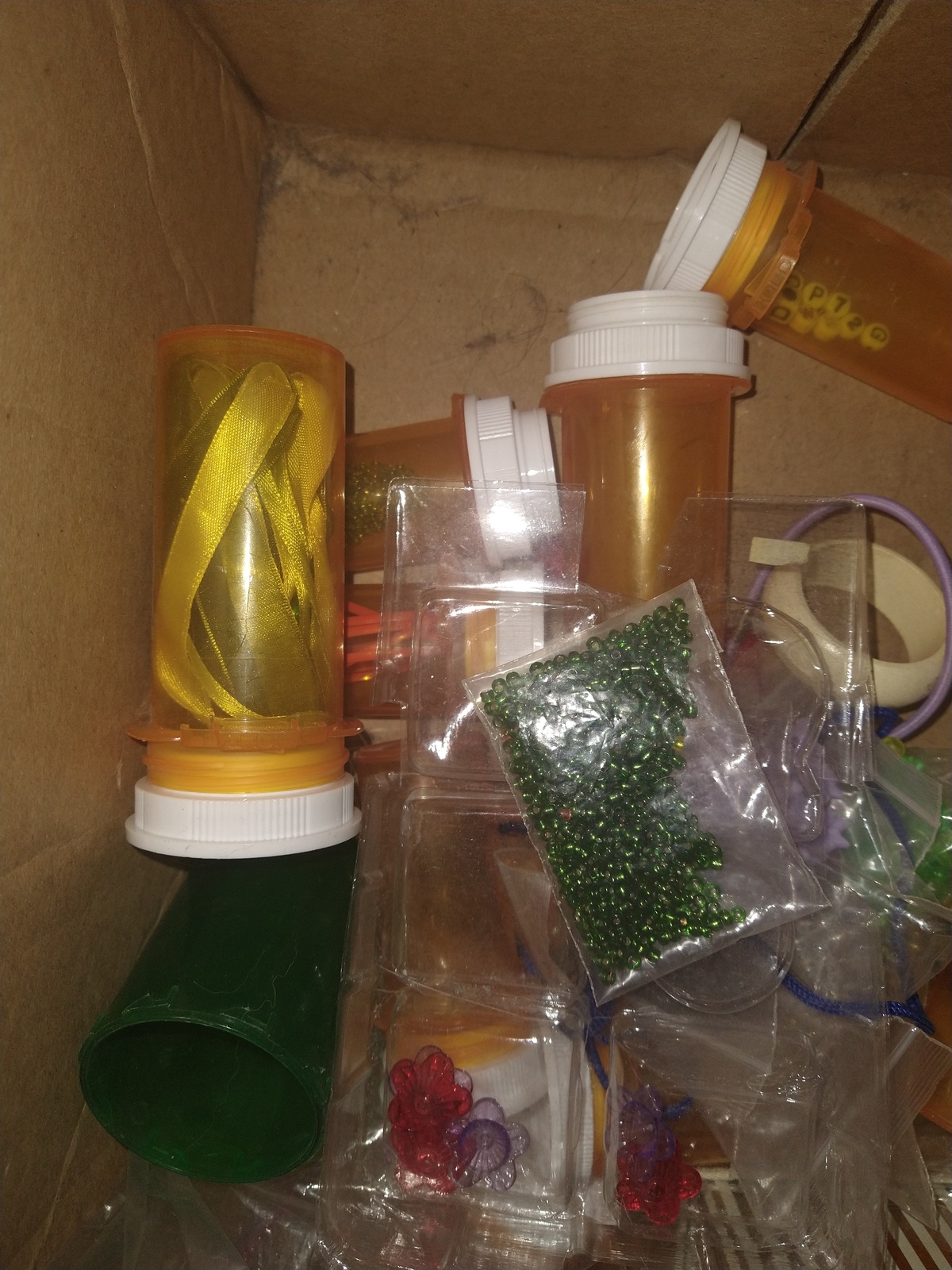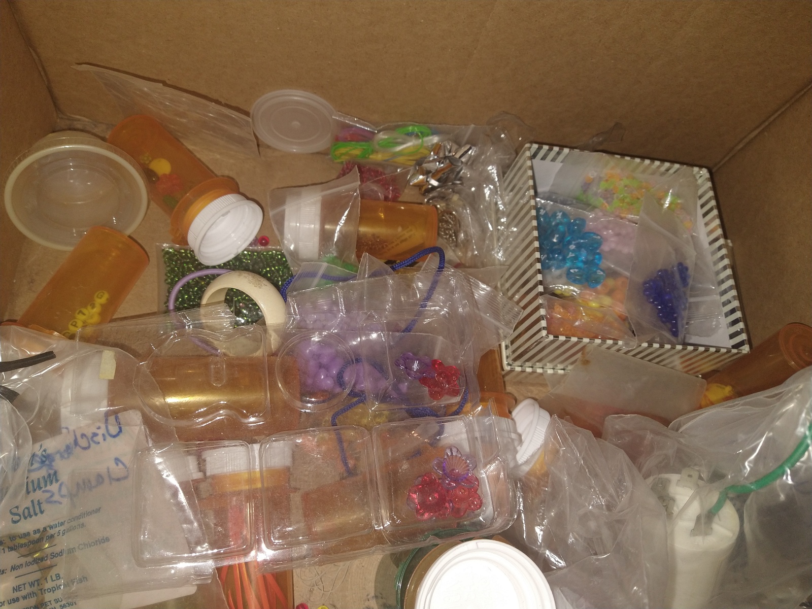 12.5 OZ. WITH BOX, BOX ABOUT 4.25" SQUARE AND 3" TALL. BEADS MAY BE PLASTIC AND OR GLASS. ALL SOLD AS-IS NO RETURN.