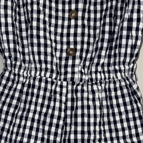 Stylish gingham romper with button details. Perfect for casual outings.