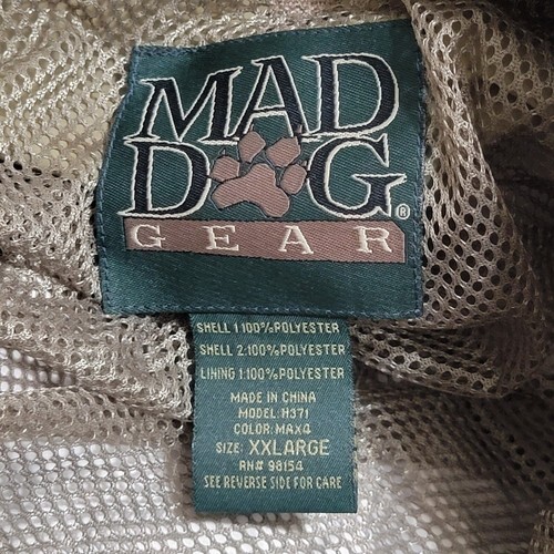 New With Tags Mad Dog Gear Advantage MAX 4 HD Camo Carnivore Lightweight 6 Pocket Pants - Model H-371. Men's Size 2XL. Actual measurements: 48" waist, 31" inseam. Adjustable fit waist - can be made smaller. 100% Polyester. Draw cord cuffs.