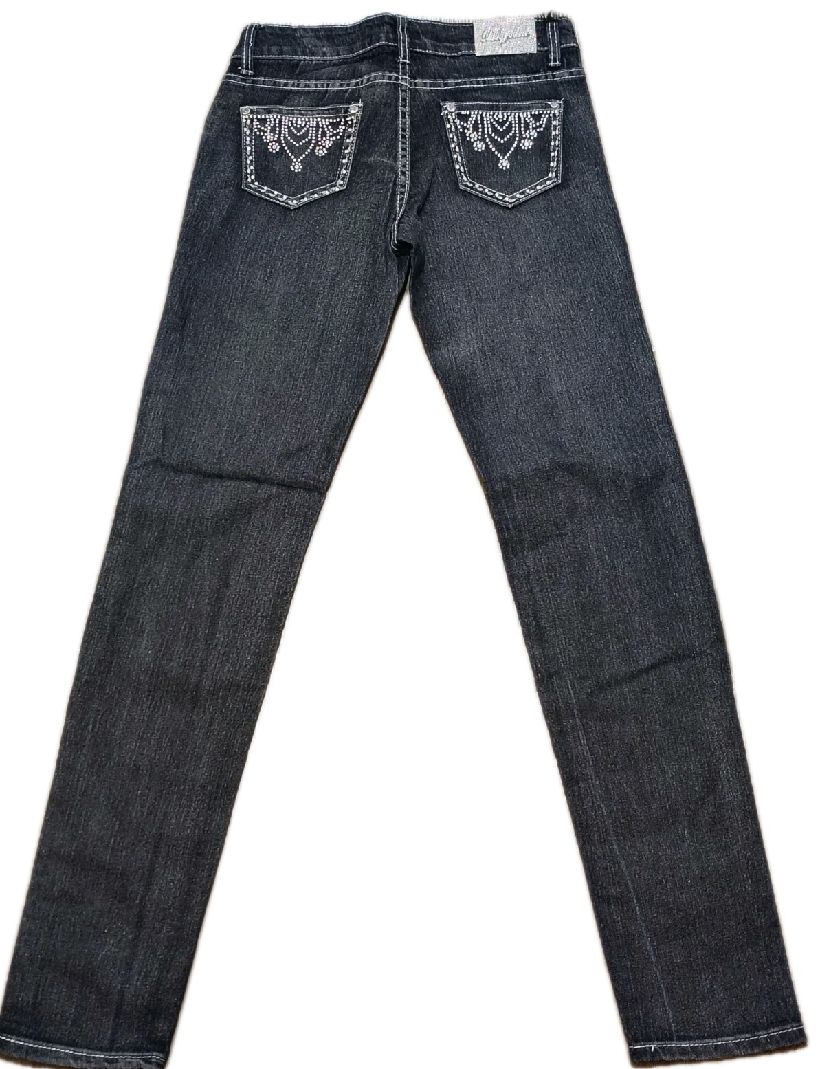 New Polyjeans Women's Low Rise Skinny Jeans in size 5 with a waist size of 28 inches and an inseam of 32 inches are a stylish and trendy choice for women looking for a flattering fit. Made from a blend of 88% cotton, 9% polyester, and 3% spandex, these jeans feature a zipper and button closure, a 5-pocket design, and a solid blue color with studded and rhinestone accents for added flair. The low rise and skinny leg style offer a flattering silhouette, making them a versatile option for all seasons.