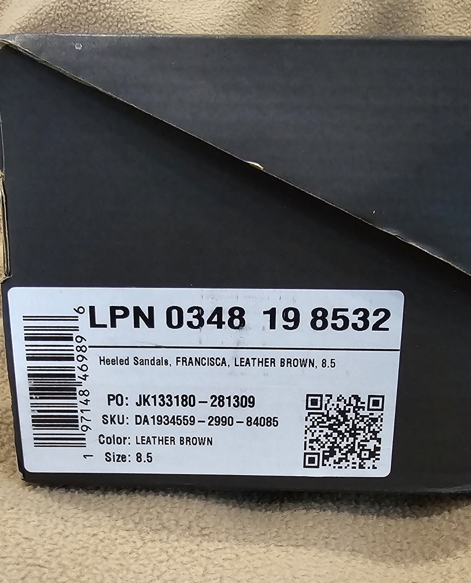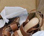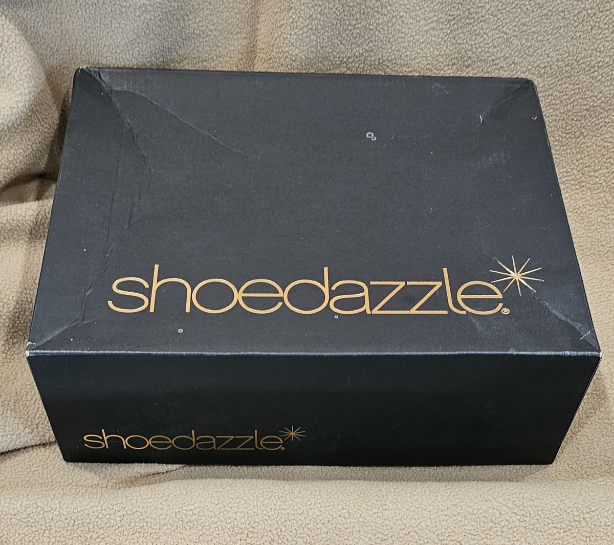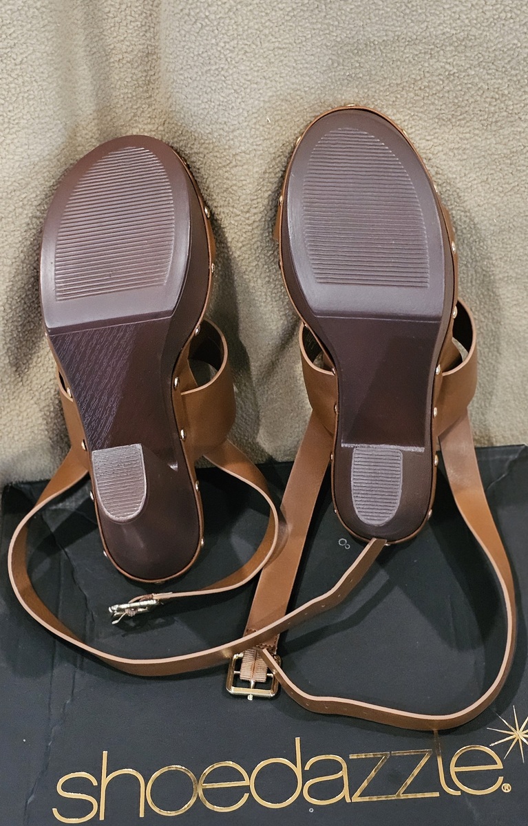THIS IS A BRAND NEW PAIR OF SHOE DAZZLE STRAPED HEELS, NEVER WORN. BROWN LEATHER COLOR BUT NOT MADE OF LEATHER, STRAP CROSSES AND CIRCLES AROUND FRONT OF ANKLE,