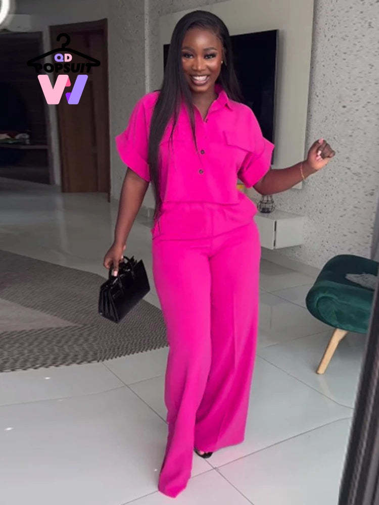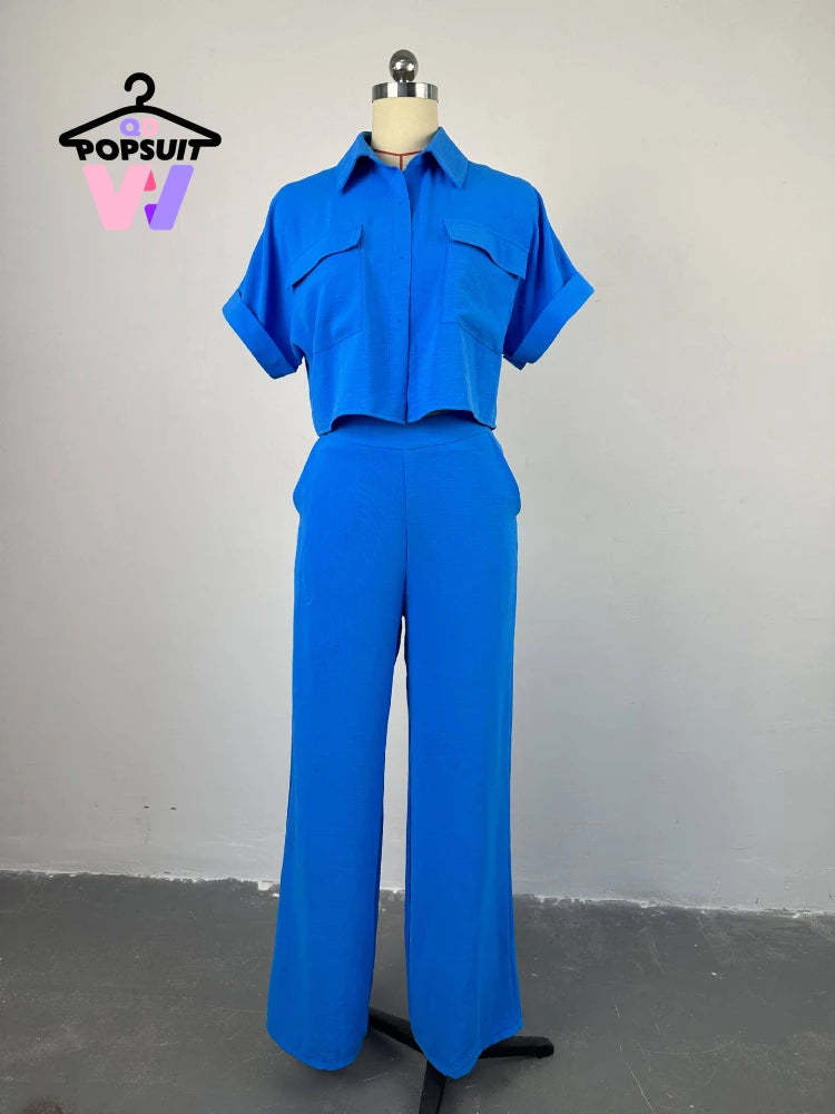 Indulge in the exquisite elegance of this 2-piece set, featuring a luxurious short-sleeved shirt and wide-leg trousers. Crafted with premium polyester and viscose material, this set is perfect for the spring/summer season. The slight stretch adds comfort to the fabric, while the solid, loose pattern remains tastefully sophisticated. With a high waist and turn-down collar, this set exudes exclusivity. Don't miss out on this must-have from our Mainland China collection, adorned with delicate buttons and a single-breasted closure. Elevate your wardrobe with this luxurious pant suit, designed for the fashion-forward and couture-minded woman.