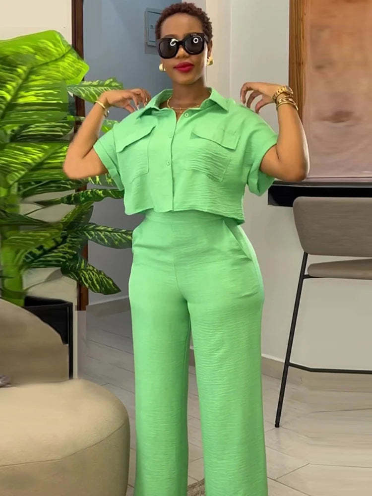 - New Summer Short Sleeved Shirt Wide Leg Trousers 2-piece Set