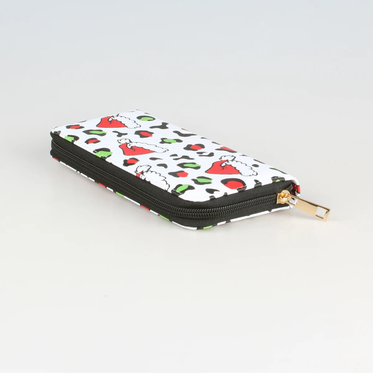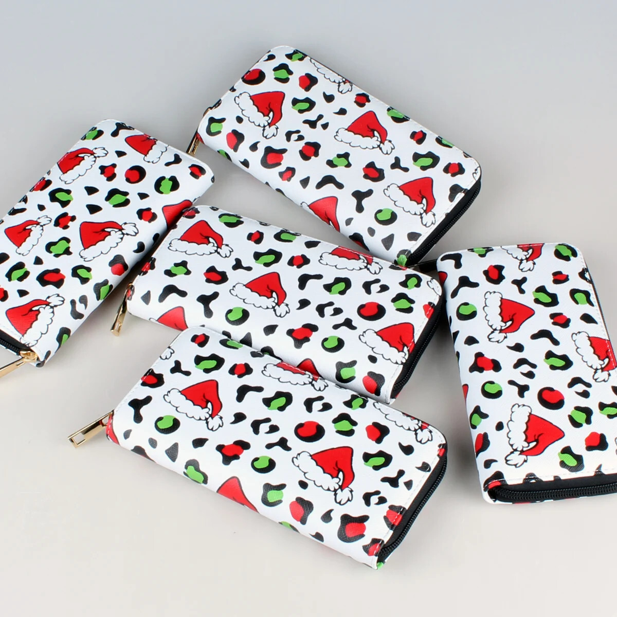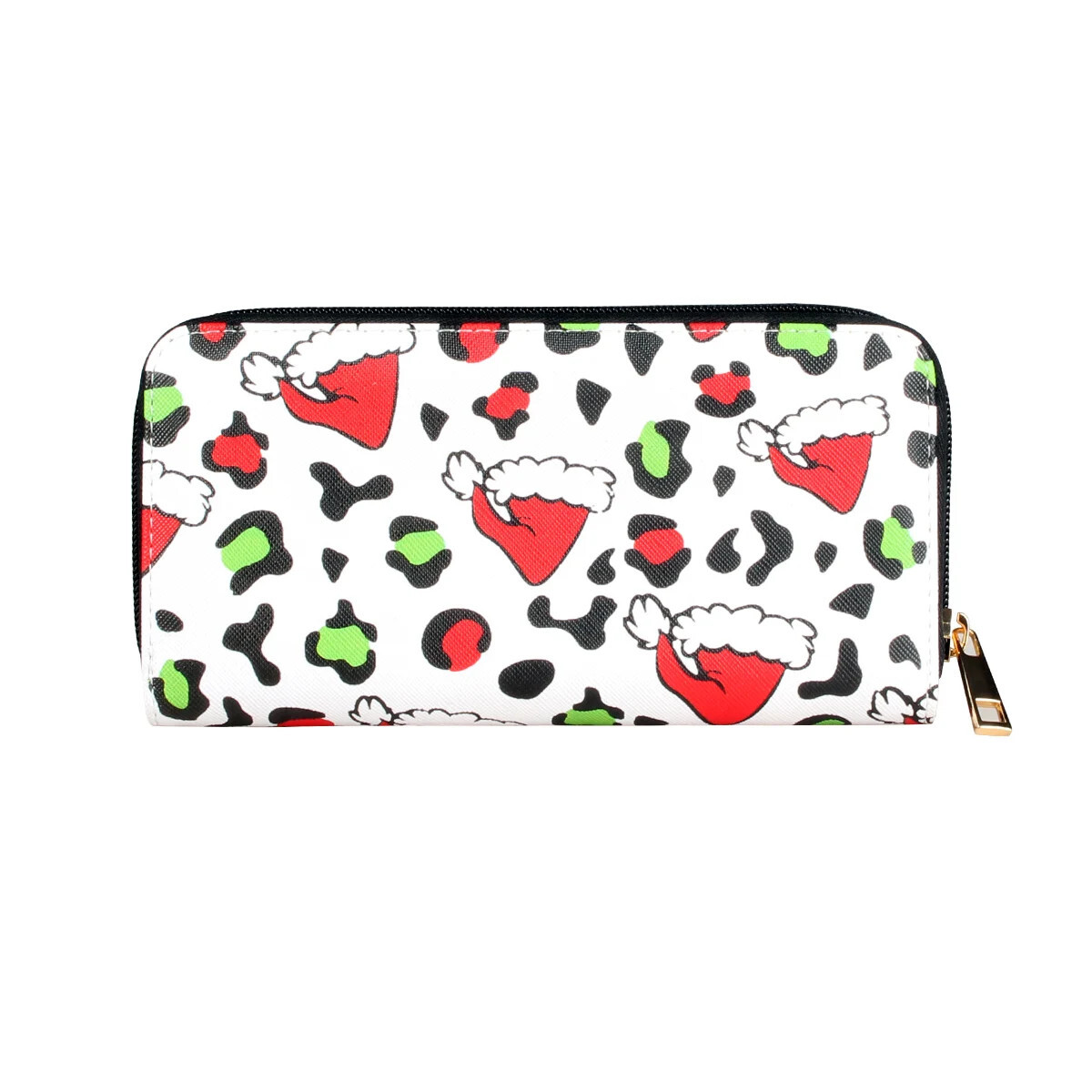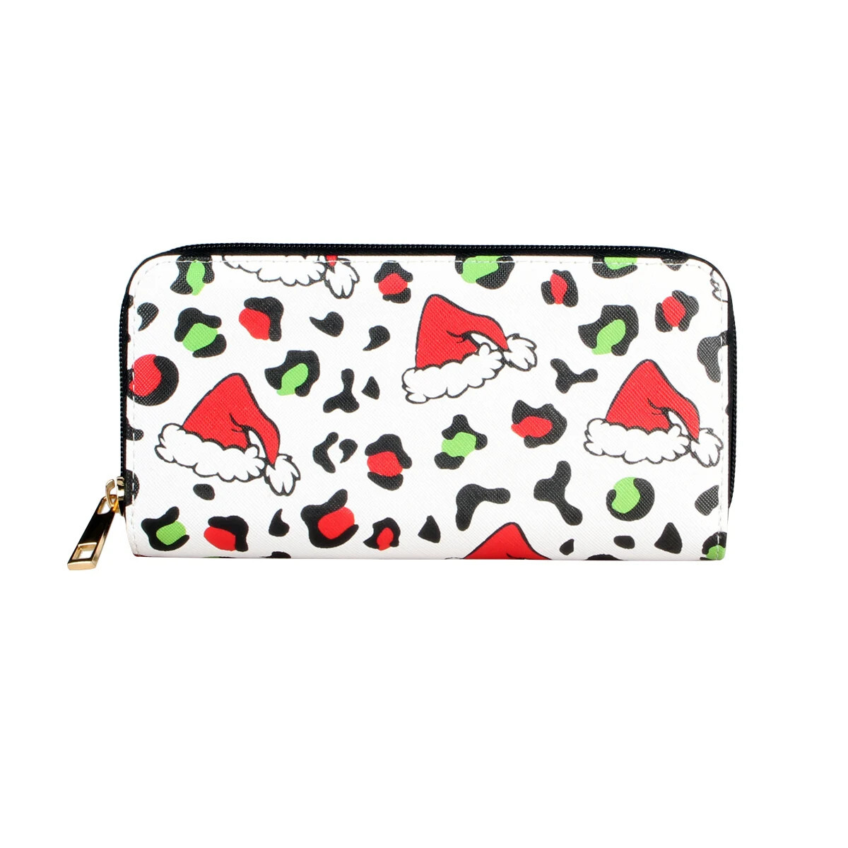Kawaii Christmas Hat And Leopard Pattern Wallet, Clutch Zipper Around Coin Purse, Classic Christmas Gift Purse