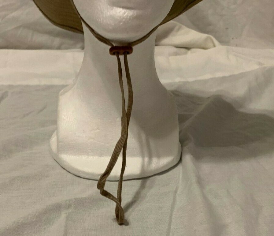 THE LEATHER STRIP ON CHIN STRAP HAS BLED ONTO THE MATERIAL OF THE BOONIE. THIS CAN BE SEEN ON THE INSIDE AND VERY LIGHTLY ON THE OUTSIDE.
