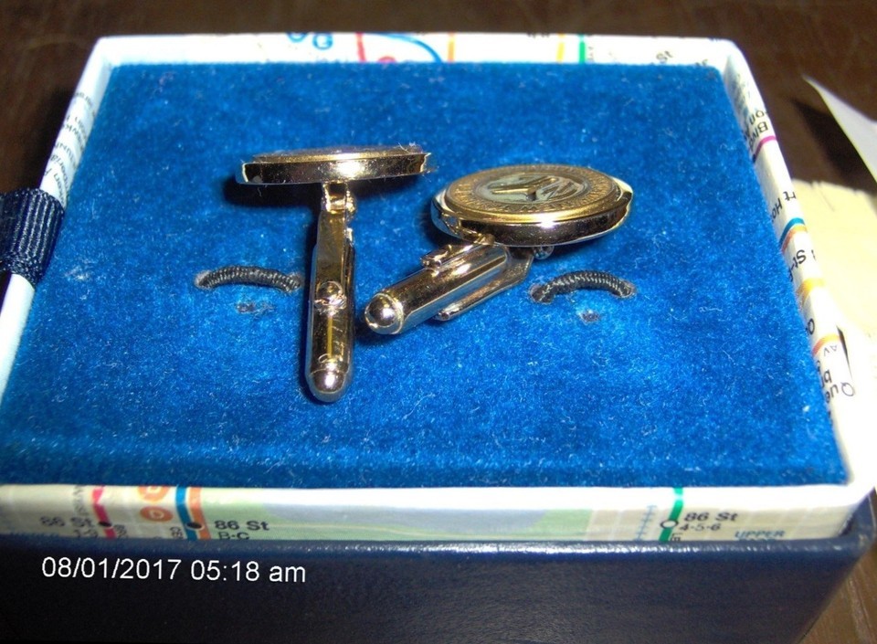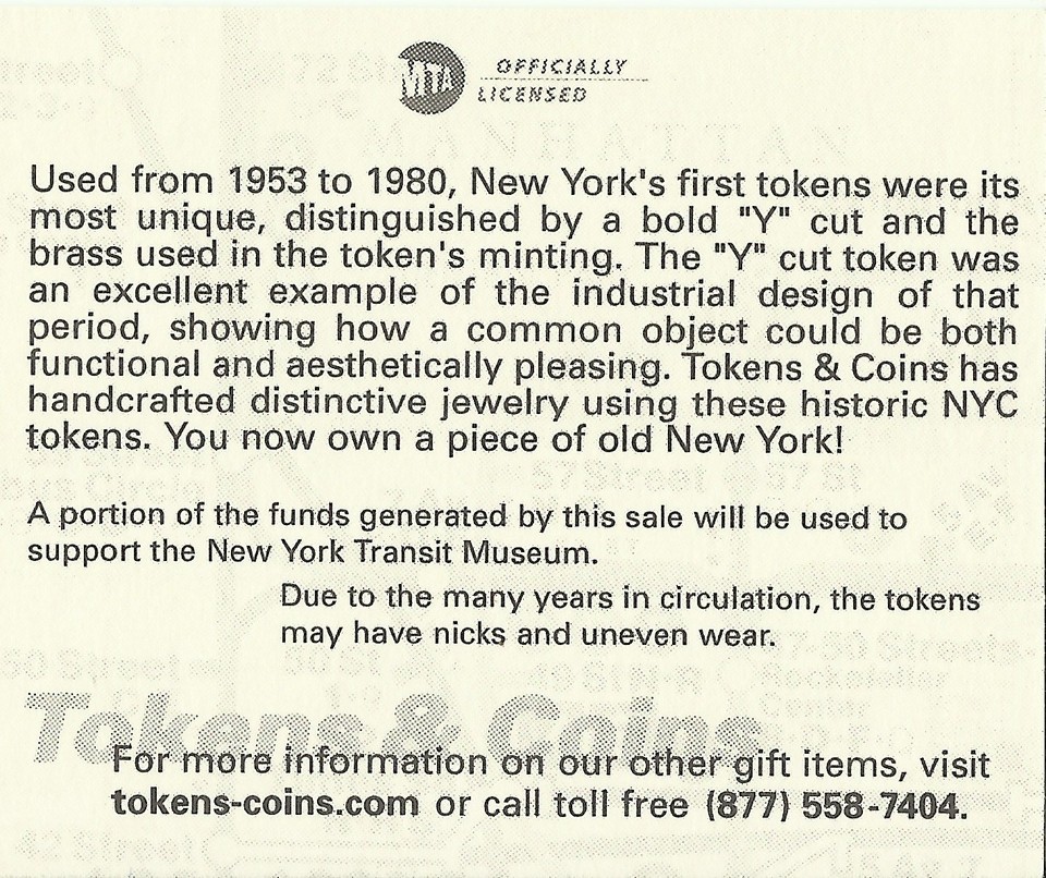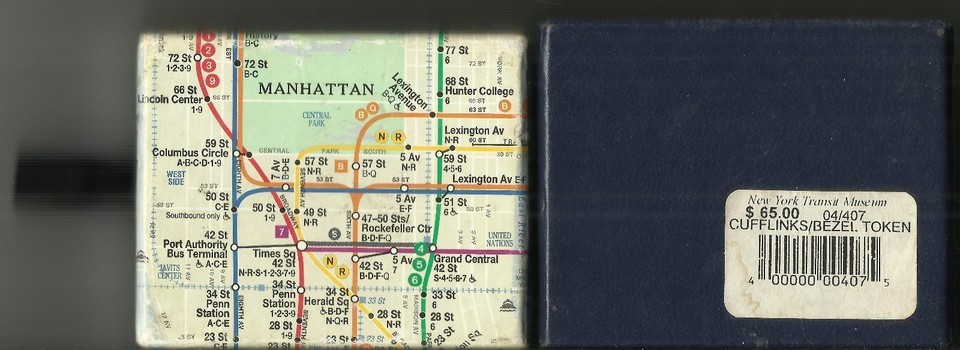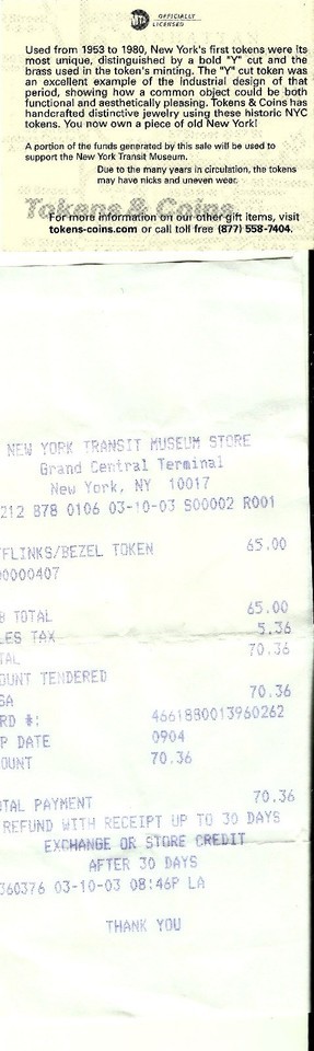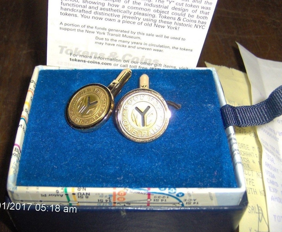FOR SALE IS THIS SET OF GENTLY USED SET OF TWO (2) GENUINE NEW YORK CITY SUBWAY TOKEN CUFFLINKS WITH GOLD PLATED BRASS BEZEL UPC# 400000004075. GENTLY USED, PURCHASED IN 2003 FROM THE NEW YORK TRANSIT MUSEUM STORE IN NEW YORK CITY GRAND CENTRAL STATION FOR $65.00, THESE ARE THE ONLY NEW YORK CITY SUBWAY TOKEN CUFFLINKS OFFICIALLY LICENSED BY THE MTA (mass transit authority) AND STILL SOLD TODAY FOR $115. INCLUDED IN THIS SALE IS MY RECEIPT FROM MY 2003 PURCHASE, CERTIFICATE OF AUTHENTICITY, THE ORIGINAL NEW YORK SUBWAY MAP THEMED BLUE GIFT BOX AND TWO (2) CUFFLINKS. THESE CUFFLINKS ARE CRAFTED FROM AUTHENTIC DIME SIZED Y cut NEW YORK TRANSIT TOKENS, THESE REAL TOKENS WERE FIRST CIRCULATED IN 1953 UNTIL 1980 AND WERE GOOD FOR A RIDE ON THE BUS OR SUBWAY IN NYC. THESE GOLD PLATED BRASS CUFFLINKS HAVE SWIVEL FINDINGS WITH EACH IDENTICAL AND AUTHENTIC TRANSIT TOKEN EMBEDDED IN A ROUND GOLD PLATED BRASS BEZEL. EACH BEZELED CUFFLINK MEASURES 3/4" IN DIAMETER AND BACK HALLMARKED NYCT. I NOTICED LOTS OF REPRODUCTIONS FLOATING AROUND , IF YOU WANT THE REAL THING, THIS IS IT. YOU WILL RECEIVE THESE GENUINE NEW YORK CITY SUBWAY TOKEN CUFFLINKS SHIPPED BY USPS FIRST CLASS MAIL.....