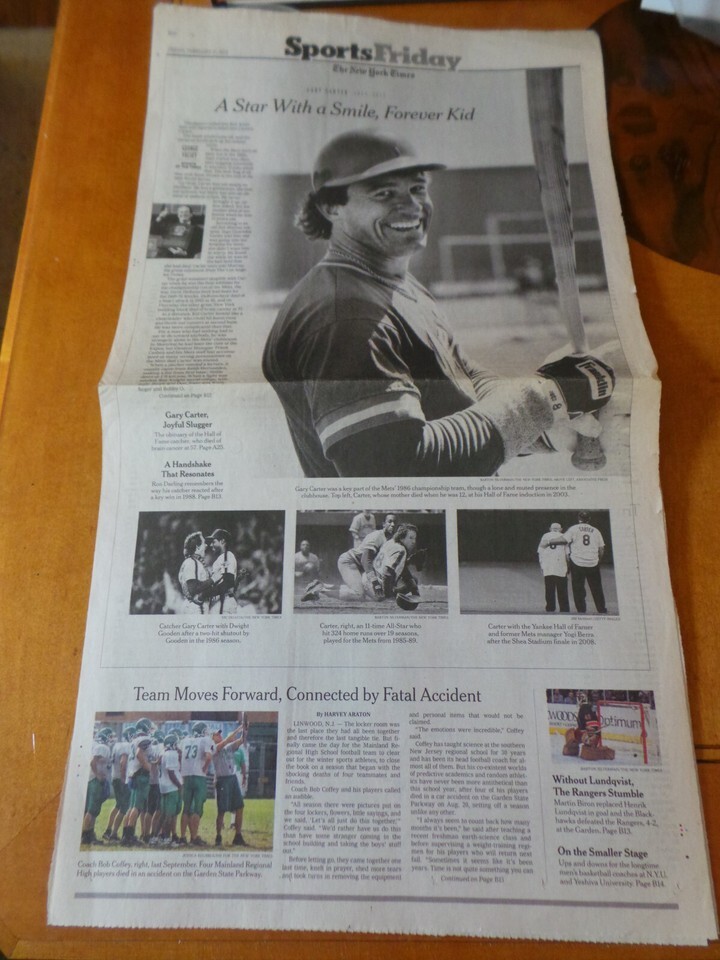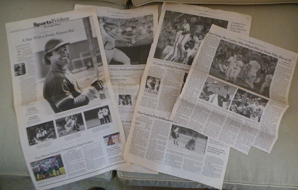 New York Times newspaper full coverage of Gary Carter of the New York Mets Obituary 2012 photo of gary from 1986 celebrating the Mets World Series victory
