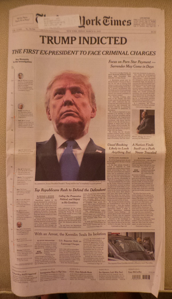 New York Times Newspaper "Trump Indicted" to face criminal charges from March 31, 2023