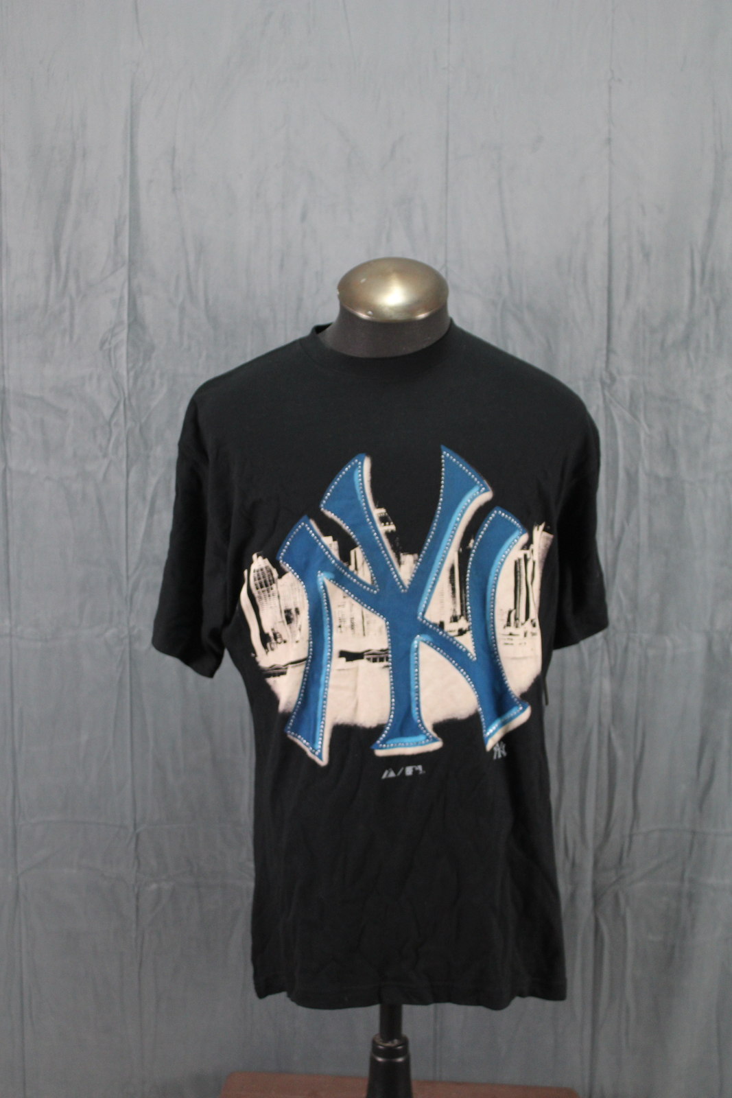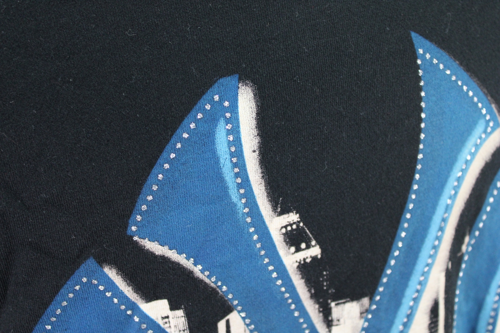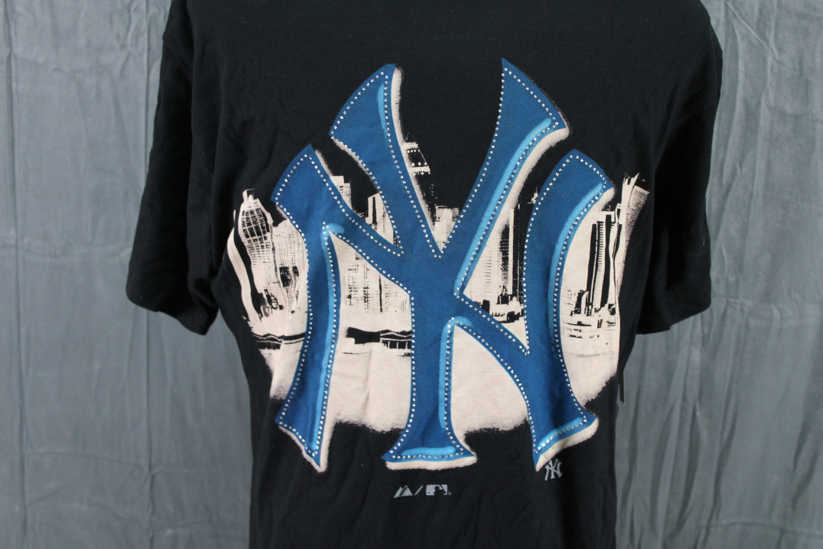 Up for sale is a New York Yankees shirt by Majestic. It is part of their home base collection and it has a black base colour. The graphic on the shirt features the New York skyline with the NY Yankees logo in front. The NY is bejeweled around the edge of the logo. What a great shirt do not miss out on it.
