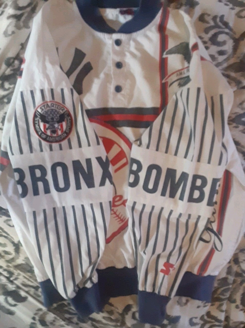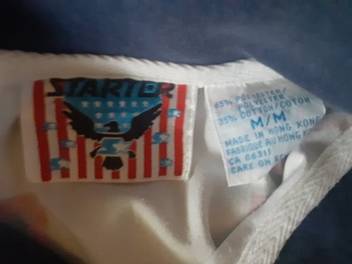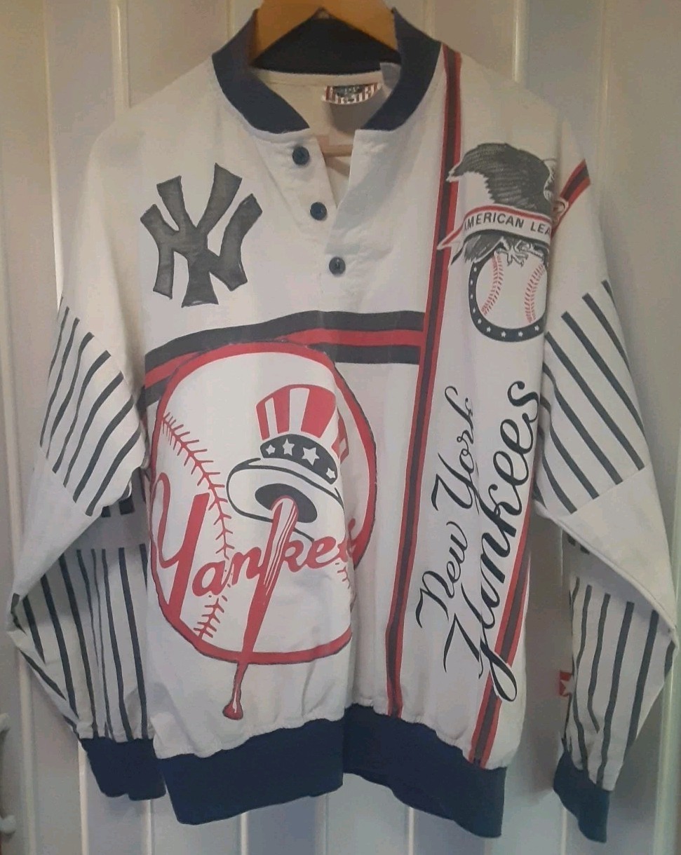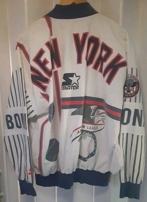 New York Yankees Vintage Starter Pullover AOP Bronx Bombers Mens Medium. A couple of small stains which may or may not come out. The blue fabric on the ny symbol has come detached in 3 areas from the embroidery thread. Please see pictures for exact condition.