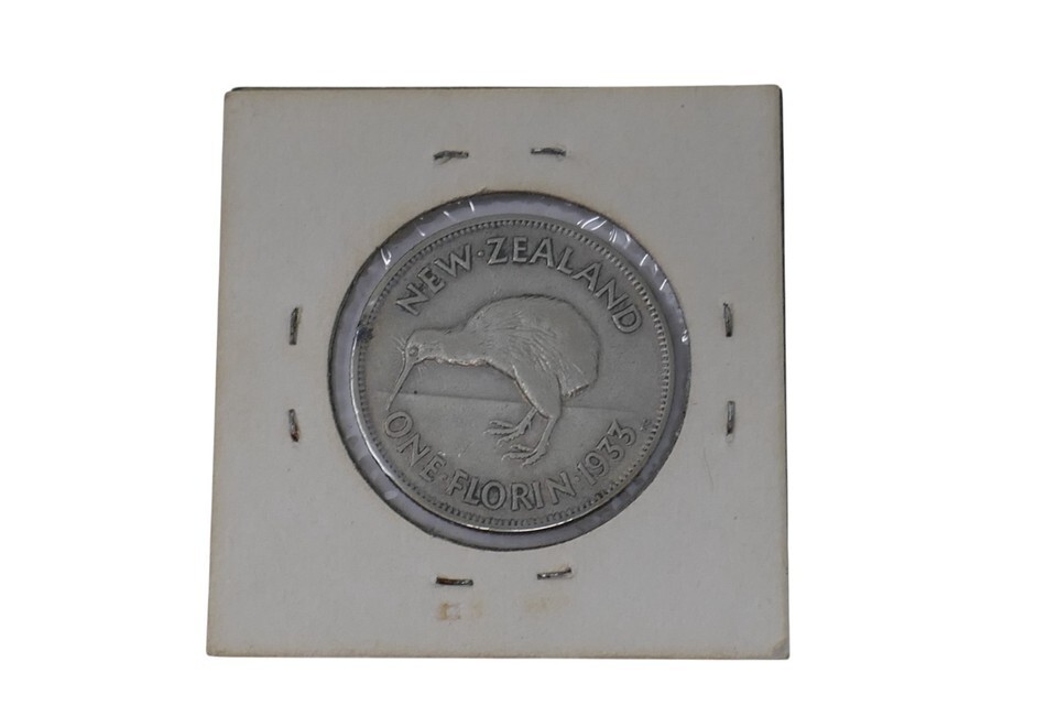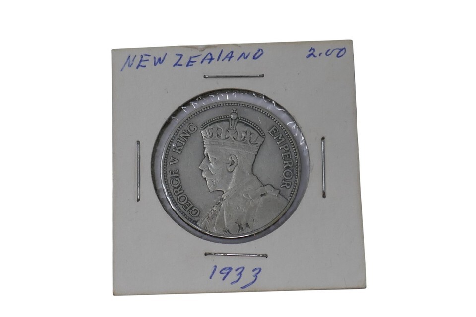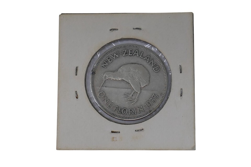 This is a 1933 George V One 1 Florin Silver Coin from New Zealand. This coin has a composition of 50% silver with a weight of 11 grams. This historical coin showcases the craftsmanship of New Zealand during the early 20th century, making it a valuable addition to any collection of world coins.