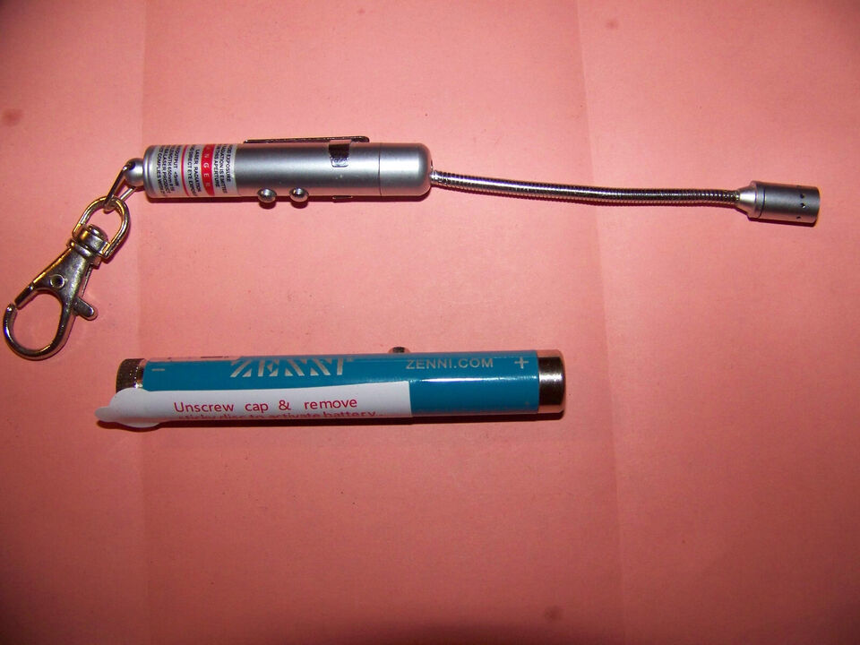 ZENNI LASER POINTER STILL HAS PLASTIC OVER BATTERIES SO BATTERIES MAY STILL WORK, FLEX LIGHT HAS NO BATTERIES IN IT, TAKES 3 BUTTON BATTERIES. ABOVE INFO FOR ZENNIE. BOTH SOLD AS-IS NO RETURN.