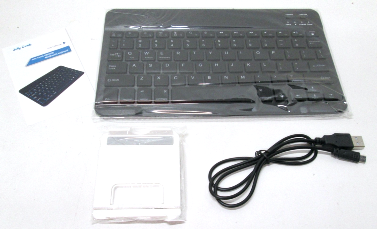 New in the Box Jelly Comb Compact Black Universal Backlit Bluetooth Wireless Keyboard. Works with all phones and tablets with bluetooth. Includes phone stand and USB charging cable. Sold with free shipping.