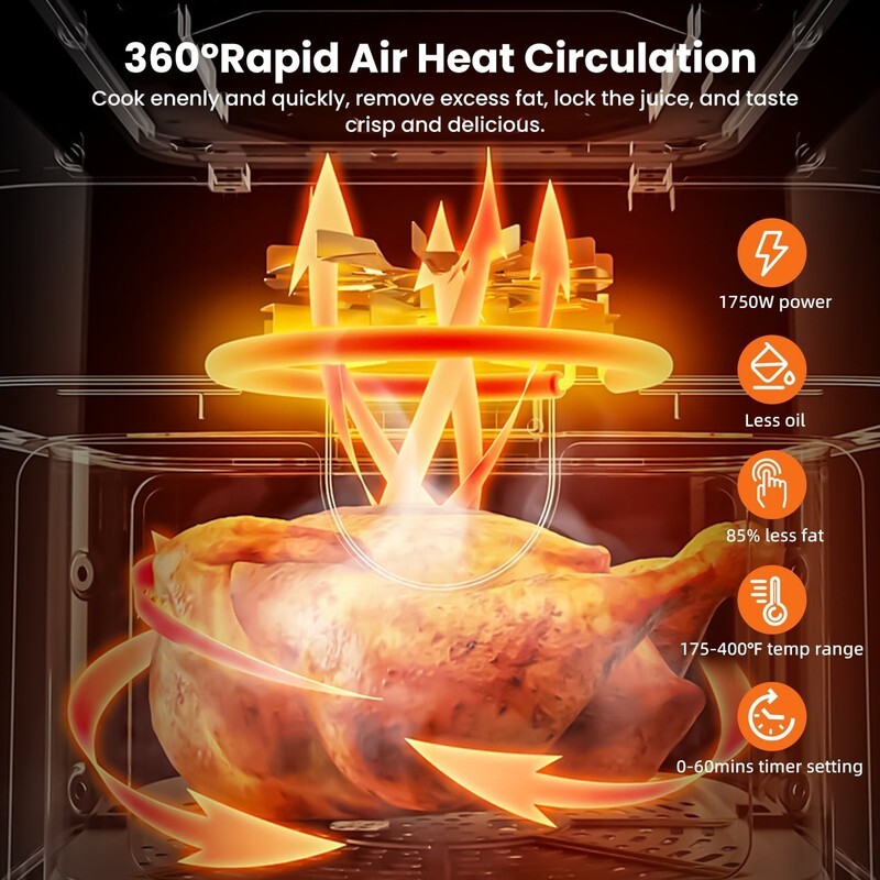 The 8.5qt smart air fryer oven employs advanced heat-wrap technology, and the 360 degree hot air circulation allows you to cook your food faster and more evenly. The Led digital touchscreen enables you to quick start with one touch, or customize cooking mode, time and temperature to your preferences. The air fryer with built-in cooking light and large glass viewing window is your perfect cooking assistant, so you can monitor the cooking progress at any time and see if the dish is done in real time without pulling out the basket. The concept of healthy, oil-free cooking is the best gift for family and friends.