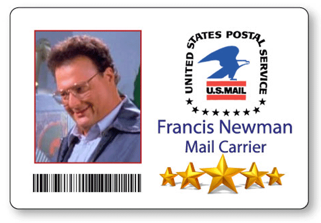 This listing is for a name badge tag ID card for FRANCIS NEWMAN, MAIL CARRIER FOR THE USPS FROM SEINFELD. Your badge will arrive with a PIN fastener on the badge. This badge is a plastic rectangle with white background, rounded corners and measures approx. 2" x 3". This badge is printed in full color with a clear overlay that protects the print for a durable long lasting badge. YOUR BADGE WILL SHIP WITHIN 24 HOURS FREE FIRST CLASS MAIL, US ONLY. Upgrades to shipping speed are available at checkout if needed.THESE ITEMS ARE PERFECT FOR HALLOWEEN COSTUMES OR FUN COSPLAY! We also carry a premium econo BLANK name badge line for businesses with high turn over employees (these badges can be personalized with our crystal clear labels.)