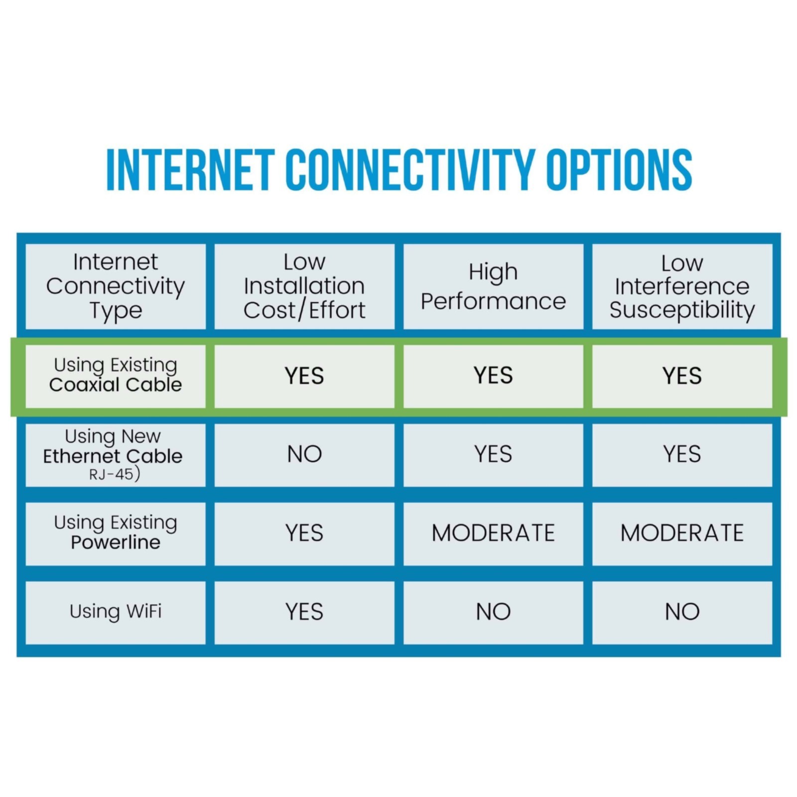 Existing coaxial cables are already installed throughout many homes and businesses. When these existing coaxial cables are NOT being used for passing Cable TV/Cable Internet services, these coaxial cables provide a perfect physical medium to create a high performing Internet connection. The combination of low interference coaxial cabling plus the efficiency of the video-optimized G.hn standard enables the best real-world Internet performance.