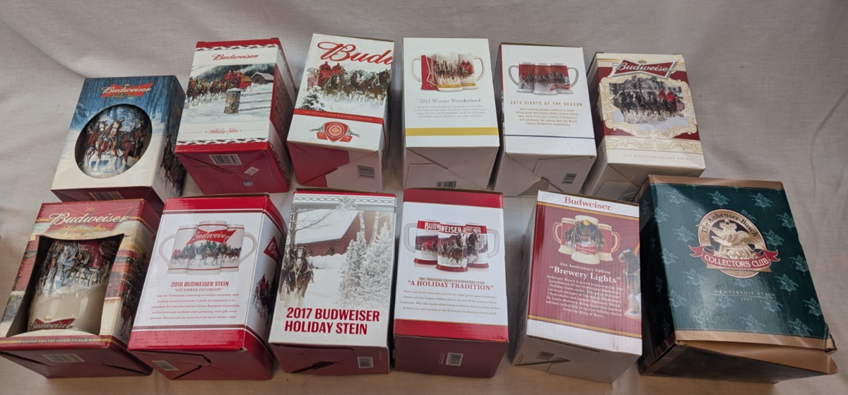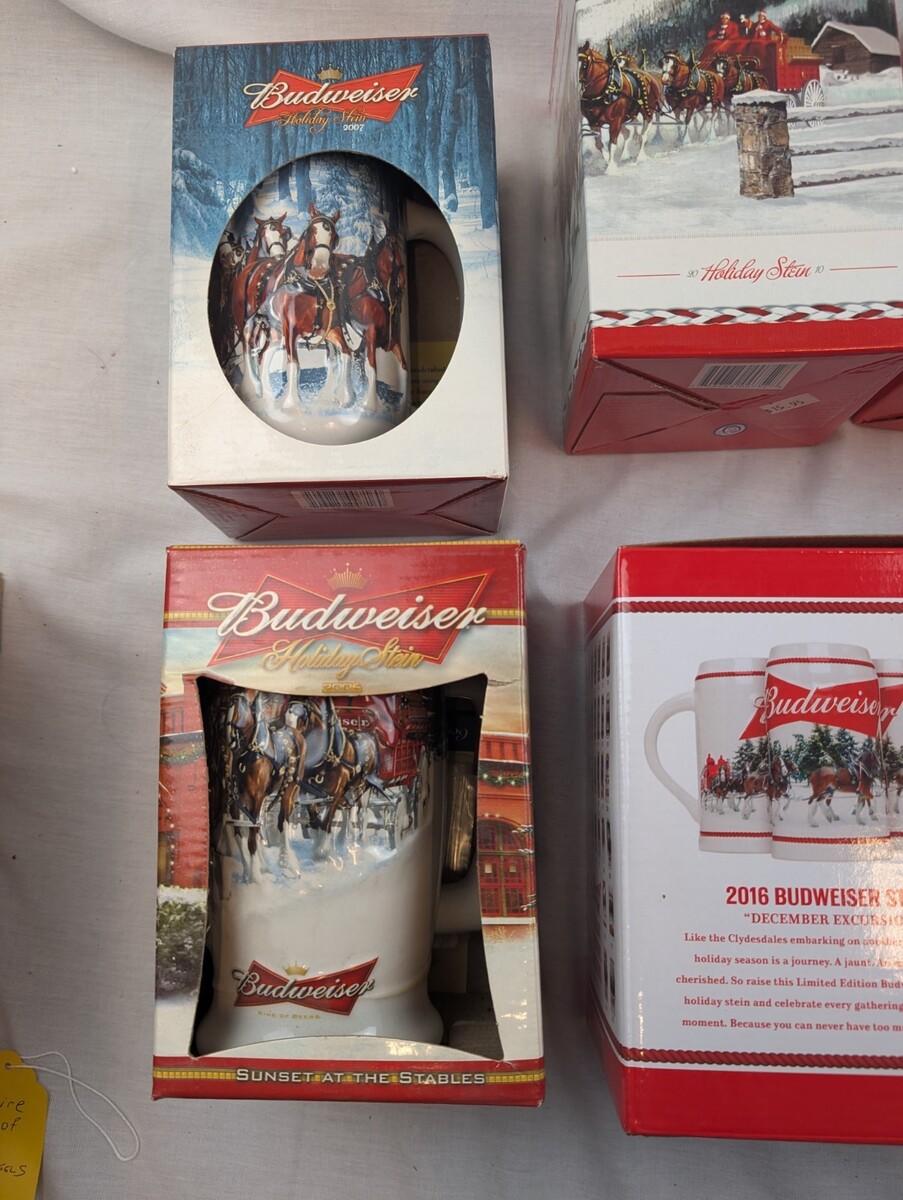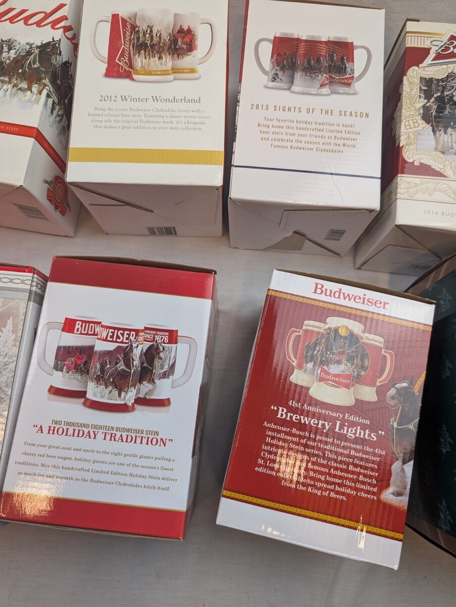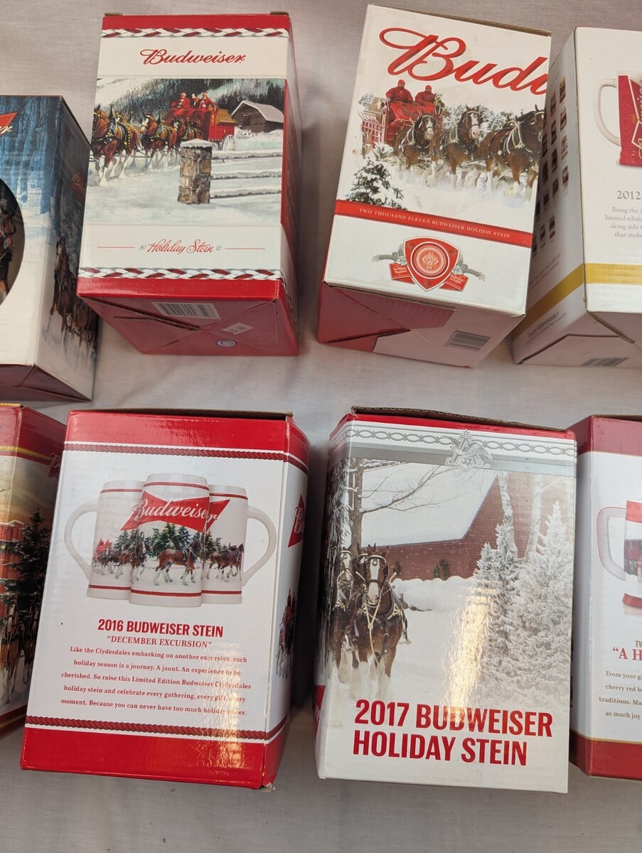 - NIB Lot 11 BUDWEISER Holiday Christmas BEER STEIN MUGS 2006-7, 2010-2020 + 1997