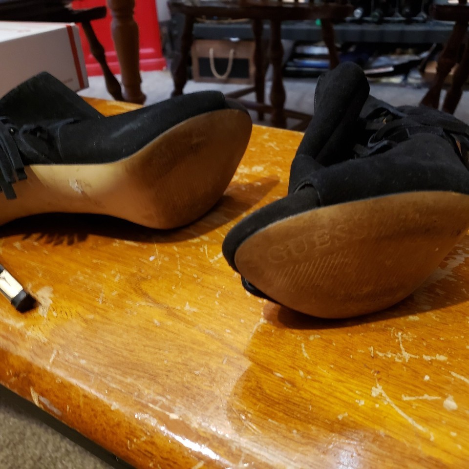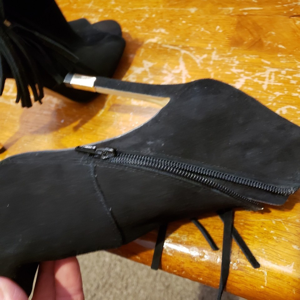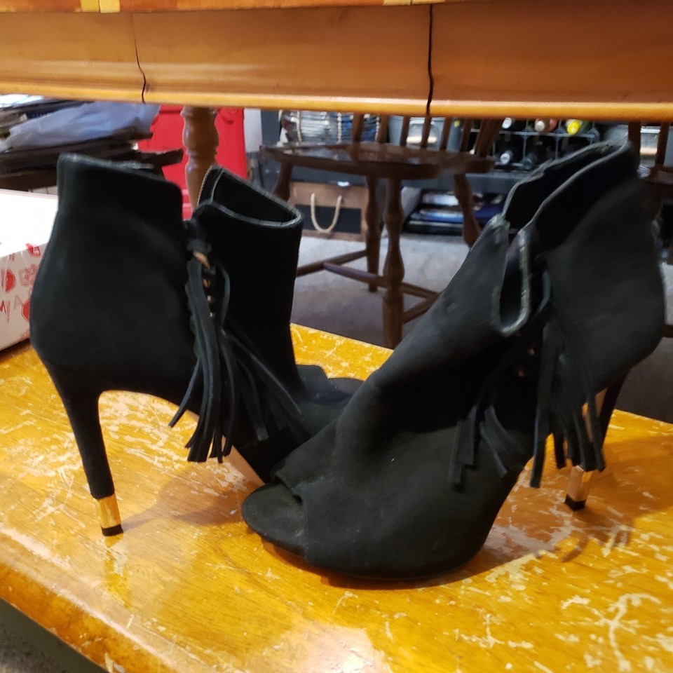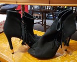 NICE GUESS Women's AZIZ Fringe Ankle Booties Heels Shoes Black Pumps model- GWAZIZ / 7.5 These are good to go. Size 7.5 See pics Some bending an creasing from being in a box in a storage unit for many years. May need a little cleaning, but for this price you CAN DO IT!!! Will ship international.