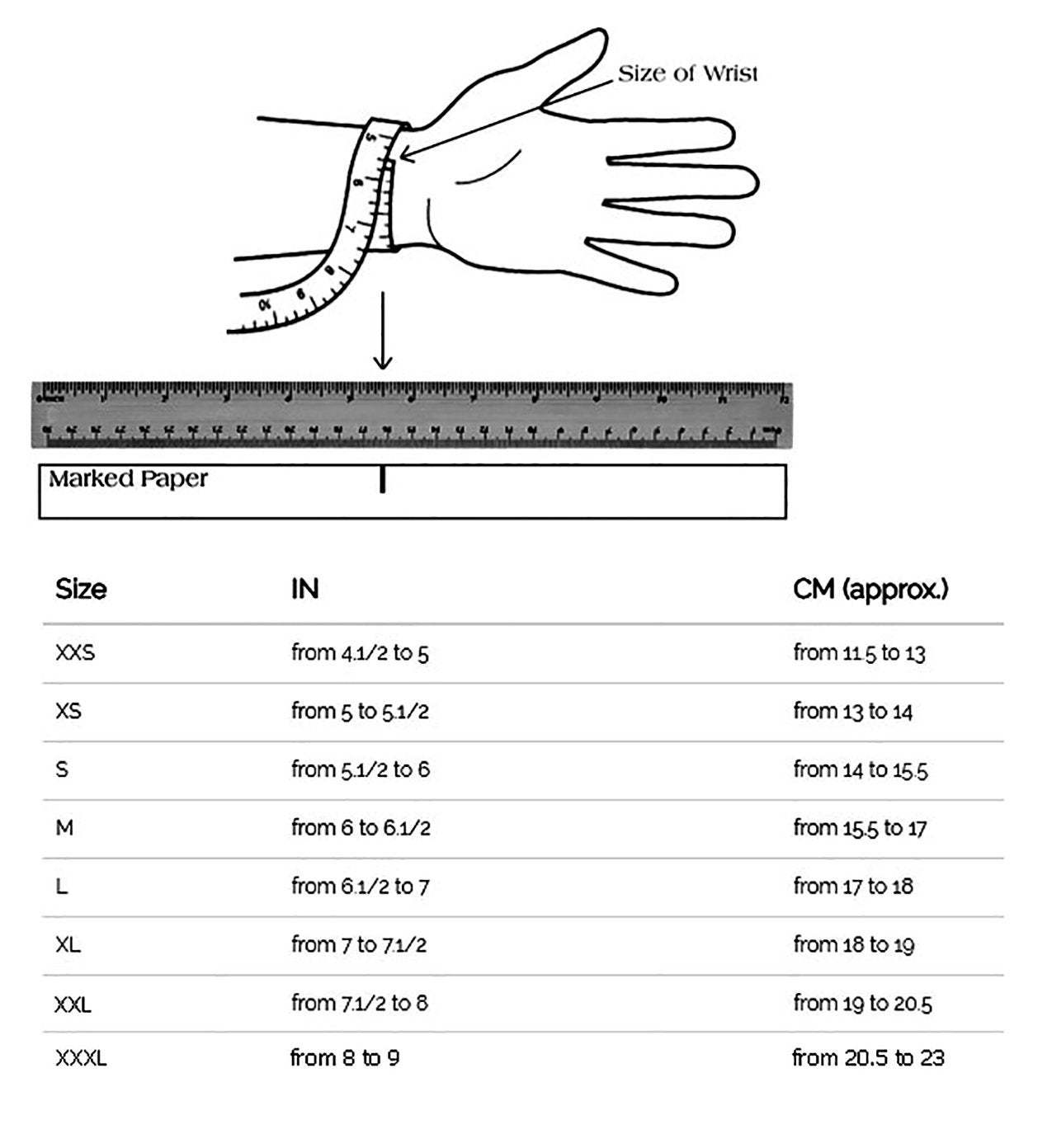 To determine your size, please measure your wrist over and around the wrist bone using a flexible measuring tape. You must measure the distance around your wrist where it is comfortable, behind the knuckle. Do NOT use the length of a current bracelet (it will not be accurate).
