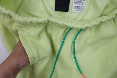 Stains back of legs. Loose threads waist. Graphics, color faded. Pilling