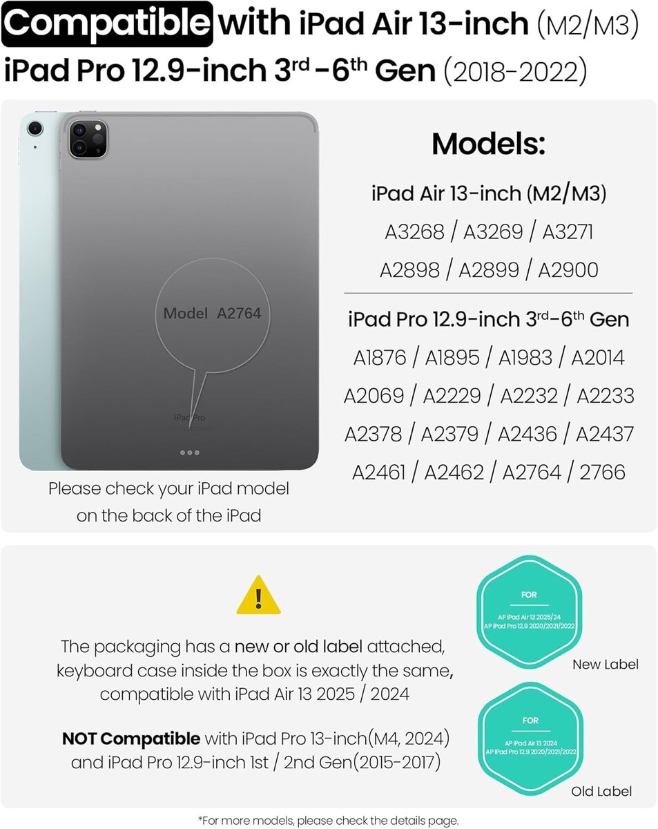 ?Turn iPad into a Laptop?Nillkin's cover with Keyboard provides RUGGED protection for your iPad, and turns the iPad into a productive laptop. This versatile accessory helps you work efficiently whether traveling, at the office or at home. *Case with keyboard compatible with iPad Air 13-inch M3 2025 / M2 2024 (A3268,A3269,A3271,A2898,A2899,A2900), iPad Pro 12.9-inch 6th Generation 2022 (A2436,A2437,A2764,A2766), iPad Pro-12.9 inch 5th Generation 2021 (A2378,A2379,A2461,A2462), iPad Pro 12.9-inch 4th Generation 2020 (A2069,A2229,A2232,A2233), iPad Pro 12.9-inch 3rd Generation 2018 (A1876,A1895,A1983,A2014). **Attention: Not compatible with iPad Pro 13" (M4, 2024).(PENCIL DOESN'T INCLUDE)