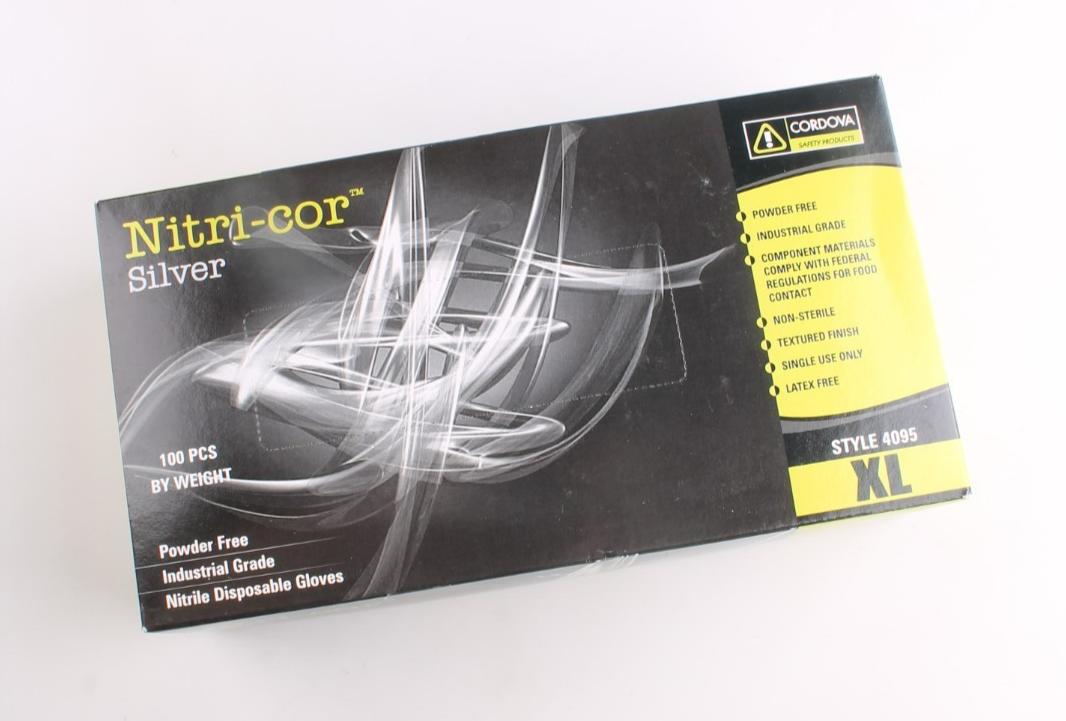 Dies gilt für eine brandneue Box mit 100 Nitri-Cor-Silbernitril-Handschuhen Industrialpulverfreie strukturierte XL 4 mil
