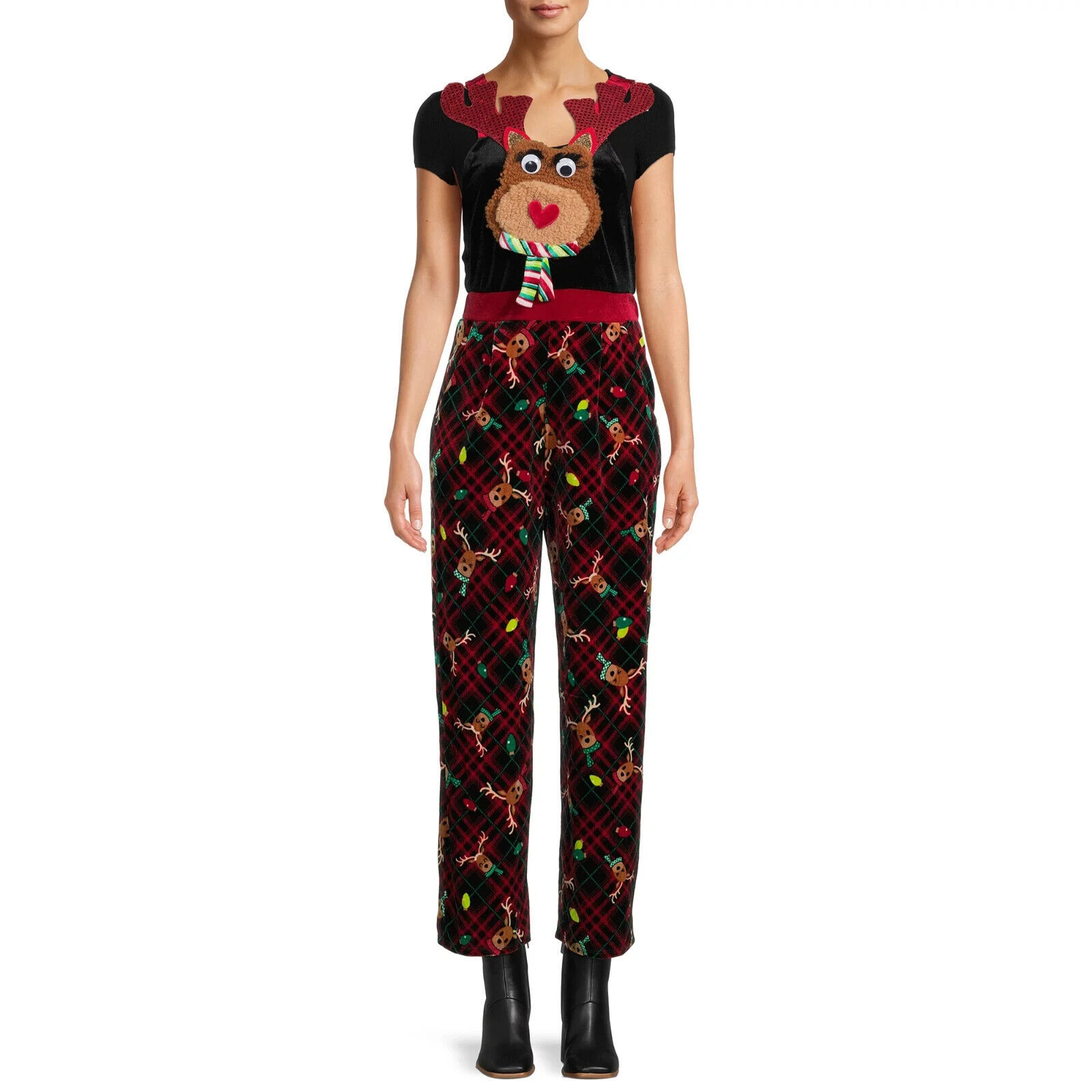 Features: Festive holiday print with contrast trim; straight leg