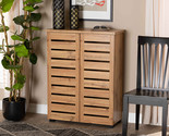Entryway organization is made easy with the Margaret shoe cabinet. Made in Malaysia, this handy piece is constructed from sturdy wood featuring a natural oak brown finish that complements modern interiors. Five shelves located behind two doors provide storage space for about fifteen pairs of shoes, depending on size. Requiring assembly, the Margaret features slatted doors that enable air circulation and prevent odor buildup. A convenient and stylish solution to your storage needs, the Margaret shoe cabinet easily finds its place within the modern home.