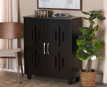 Features: Constructed from rubberwood, MDF wood, and LVL Walnut brown finish Four (4) shelves behind the doors provide space for 8 pairs of shoes Cut-outs enable air circulation and deter mold growth Metal handles Solid and Quality Construction Set Includes: One (1) Shoe Cabinet