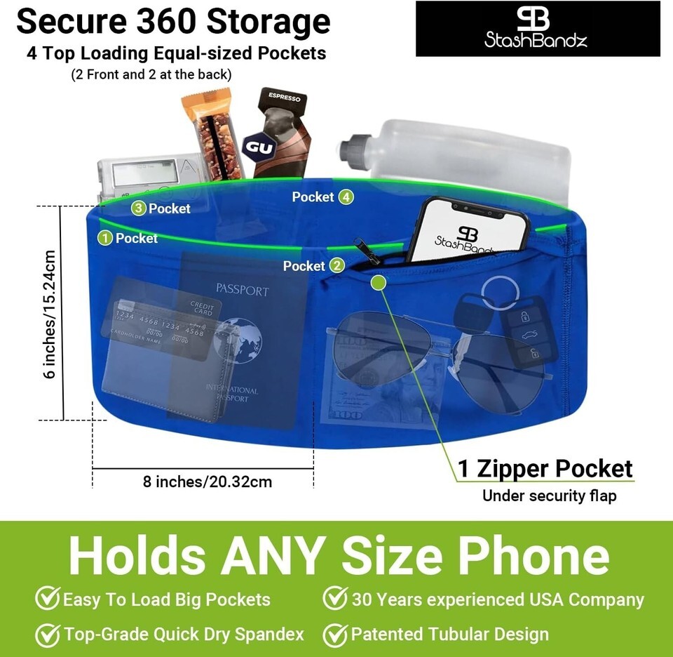Multi-purpose patented 4-Pocket Running Belt helps secure your essentials without any bounce.