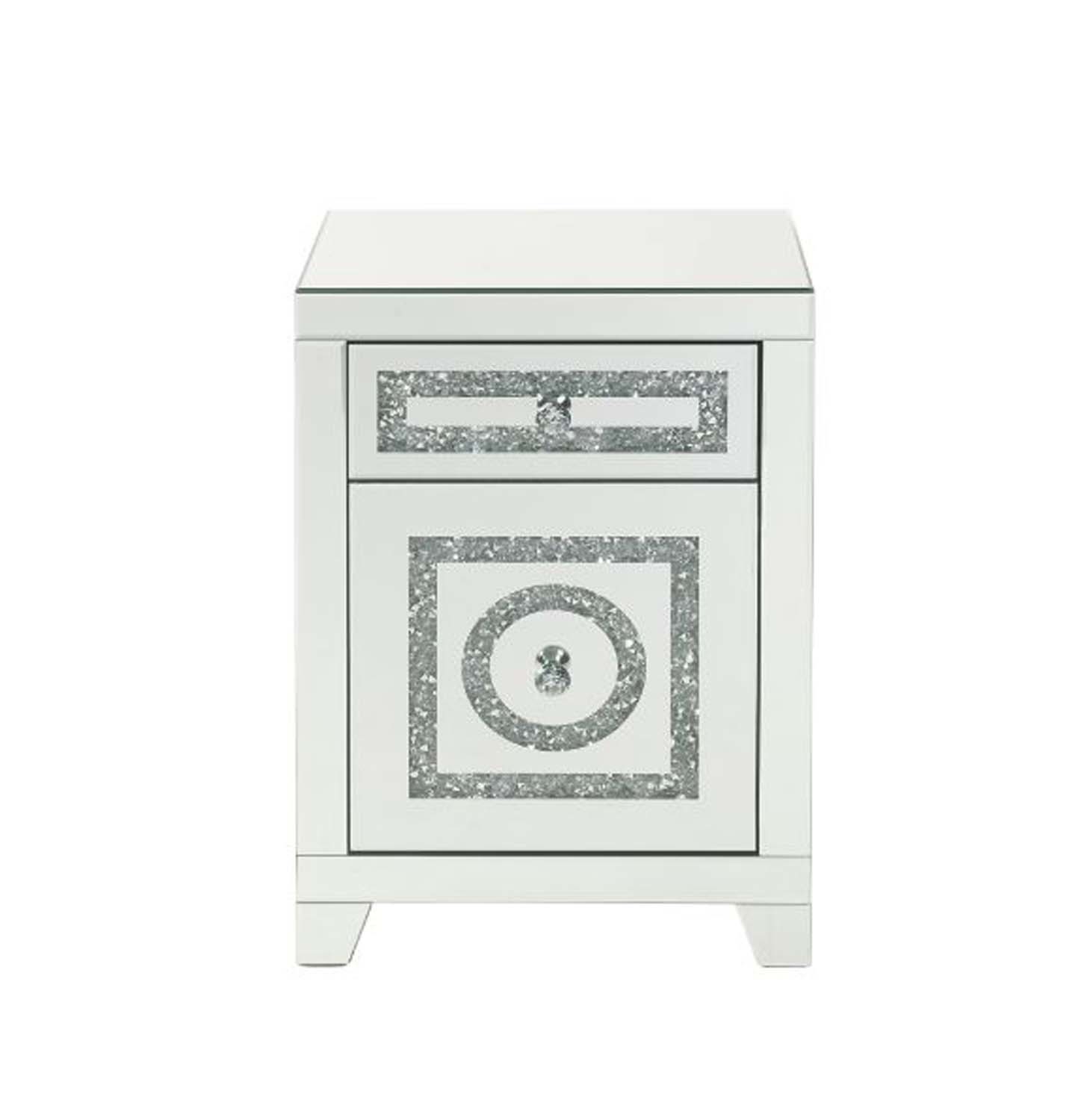 The Noralie Accent Table will give any room a touch of glamour. Mirror and glass materials give it a modern and clear touch while faux diamond inlays add glam style to this piece. Use this unique piece as the perfect accent for any room decor. It has a storage drawers with self closure and safety stop, providing ample and convenient storage for small electronics, cosmetics, accent items, jewelry, and more.