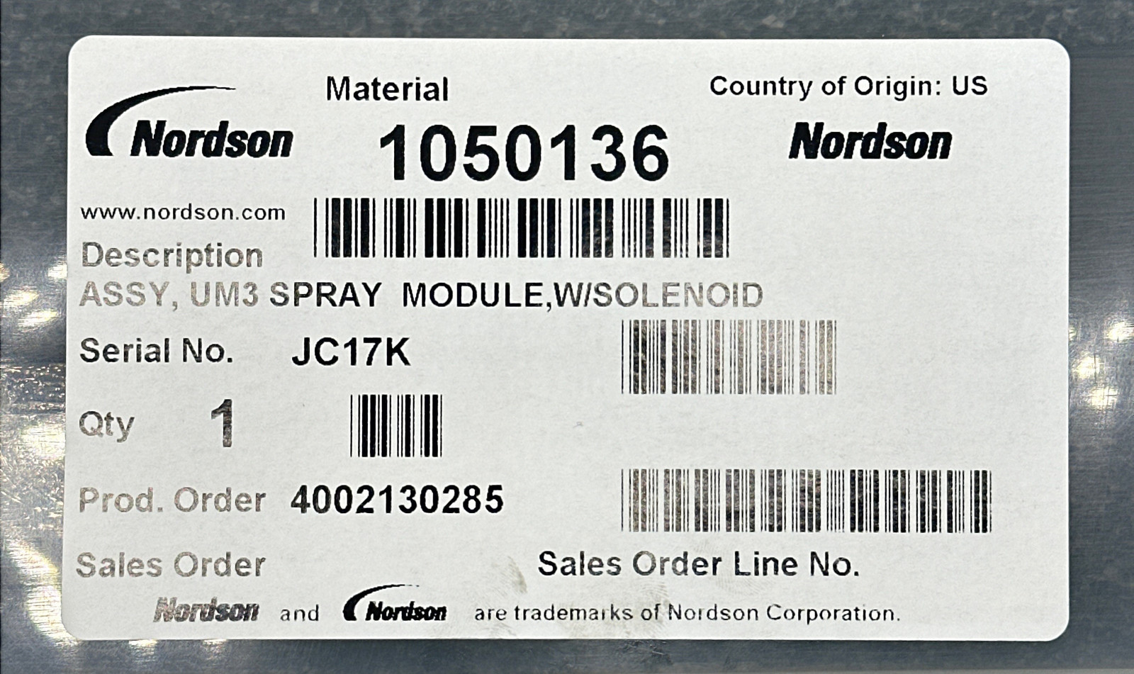- Nordson 1050136 Hot Melt UM3 Spray Module W/Solenoid Valve