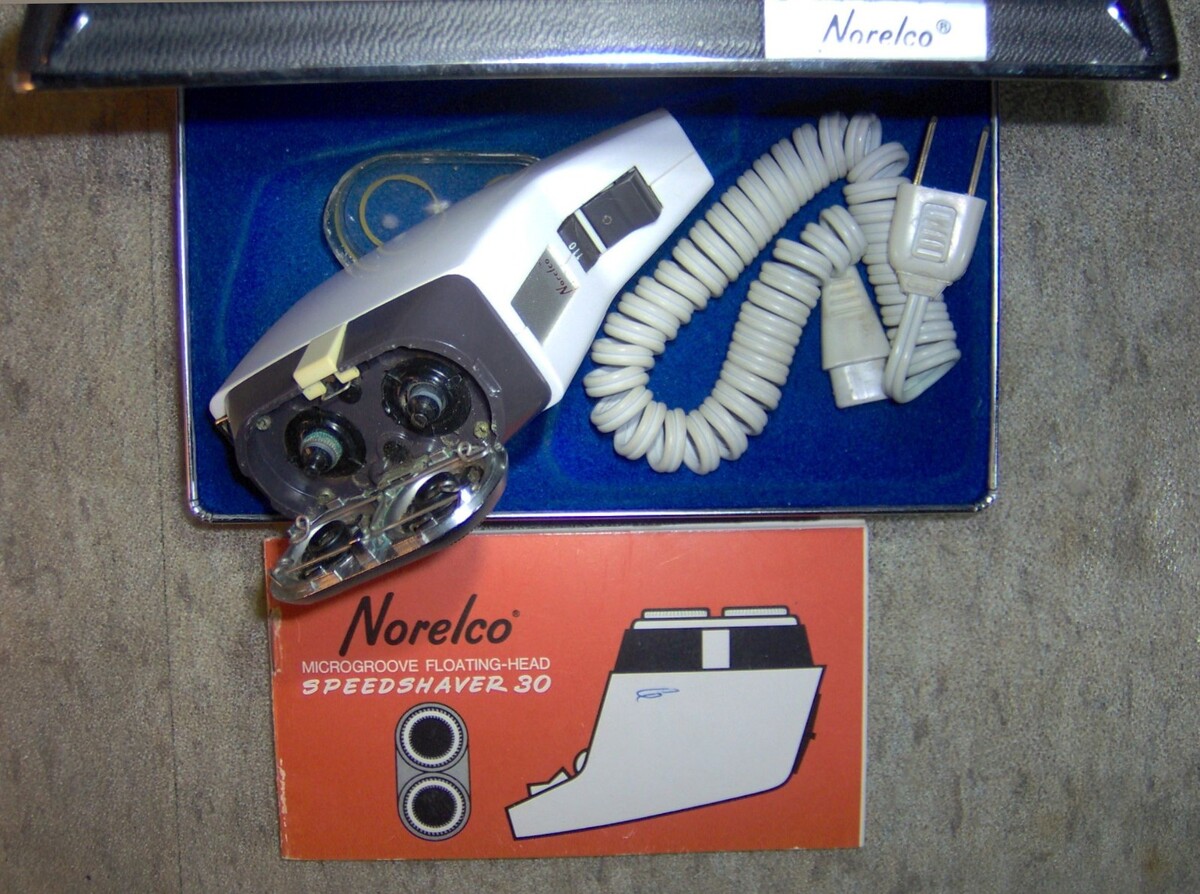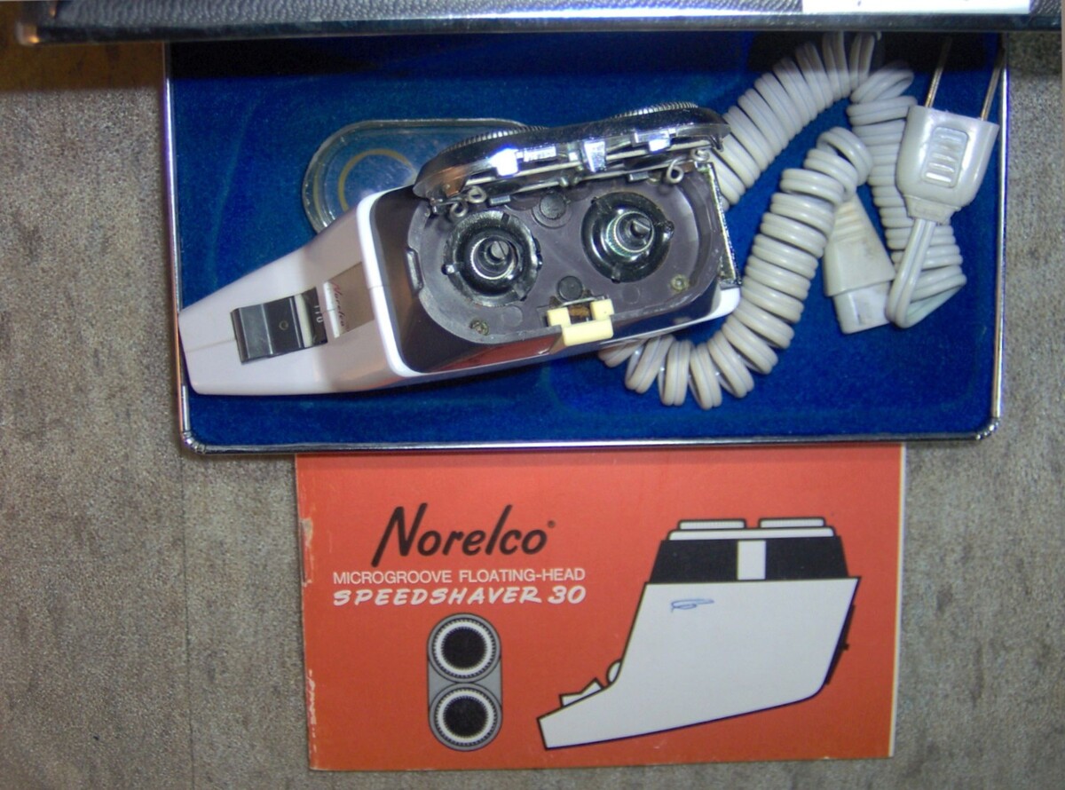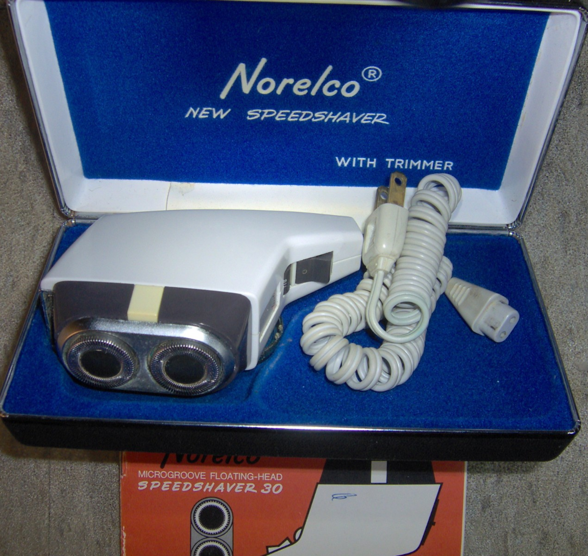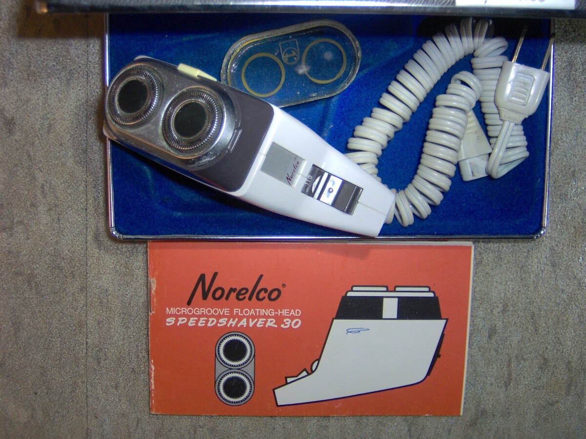 (1) USED VINTAGE NORELCO FLOATING HEAD SPEEDSHAVER 30 (SC 8010) ELECTRIC SHAVER WITH TRIMMER, AC POWER COILED CORD, PRINTED MANUAL AND ORIGINAL CASE MANUFACTURED BY NORTH AMERICAN PHILIPS COMPANY INCORPORATED NORELCO SHAVER DIVISION MPN SPEEDSHAVER 30 (SC8010). USED WITH SIGNS OF WEAR AND AGE, TESTED GOOD, MADE IN THE MID 1960s. THE BLADE(s) CONDITION IS UNKNOWN BUT BLADES FUNCTION FINE, CLEANED OUT REASONABLY WELL. YOU MAY SPOT A FEW WHISKERS INSIDE. THIS NORELCO ELECTRIC SHAVER FEATURES MICROGROOVE FLOATING HEAD AND RETRACTABLE TRIMMER FOR MOUSTACHE AND SIDEBURNS. THIS WAS A POPULAR CHOICE FOR MANY MEN IN THE 1960s. YOU WILL RECEIVE ONE (1) USED NORELCO SPEEDSHAVER 30 WITH CORD, MANUAL AND CASE, AS PICTURED, SHIPPED BY USPS....