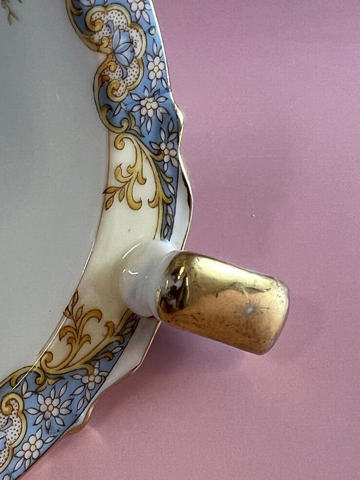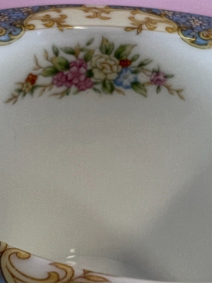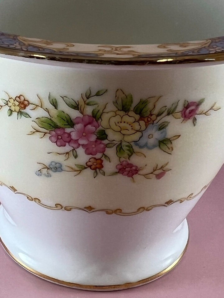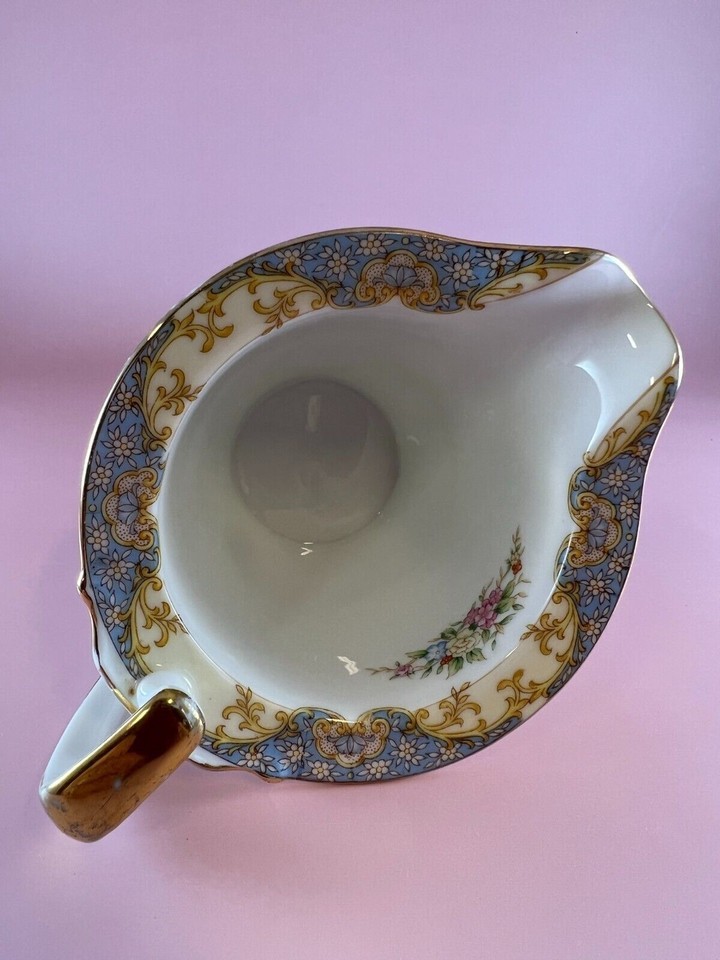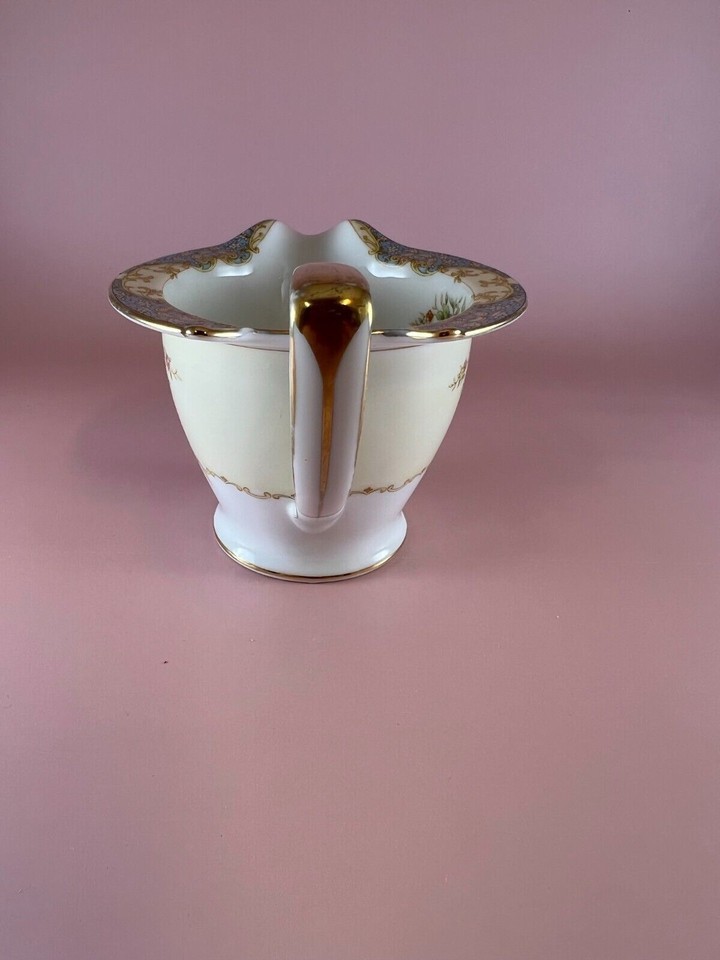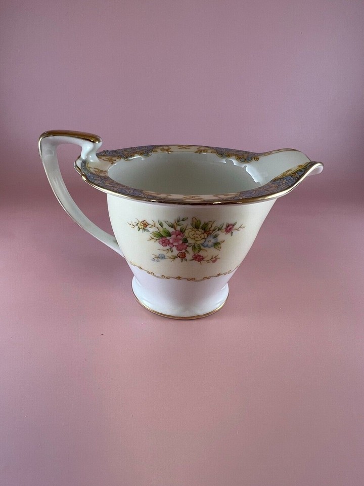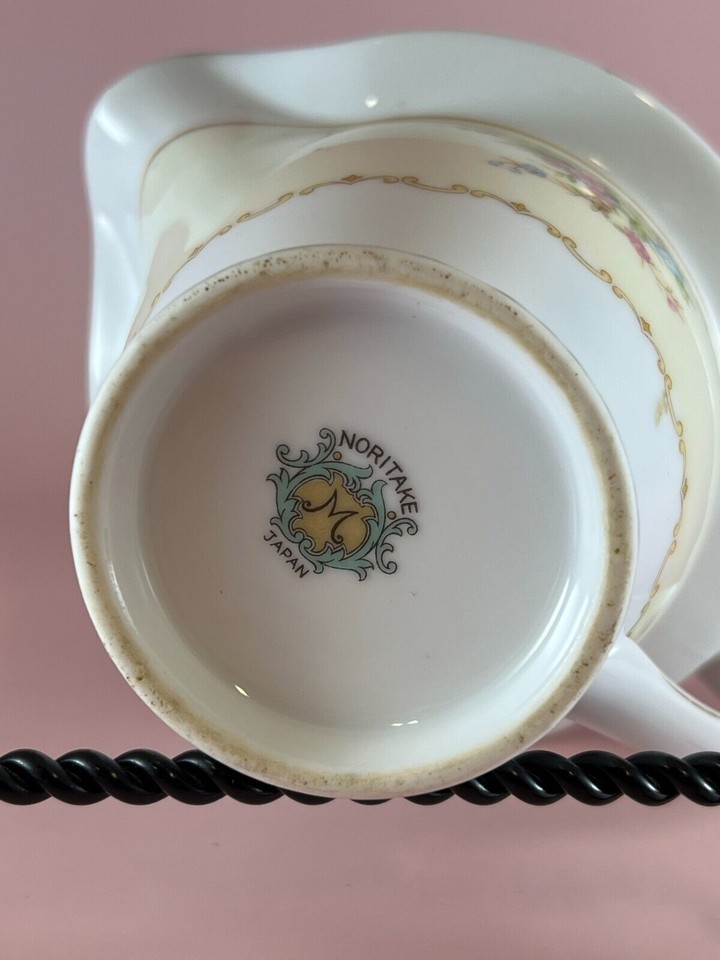 Vintage Noritake porcelain creamer made in Japan. This creamer has the familiar wreath-circled ?M? for ?Morimura? back stamp, which was registered in 1933. The creamer is white and cream. It has pink, yellow, and blue flowers on it. It is trimmed in gold. The rim of the creamer has a design that is yellow, cream, and blue. The creamer measures 5.5? spout to handle, 3? high, and 4? across. The spout measures 3.25? in height, and the handle measures 3.5? in height. The creamer is in good condition with no chips, cracks, or crazing. There is some wear to the gold trim.
