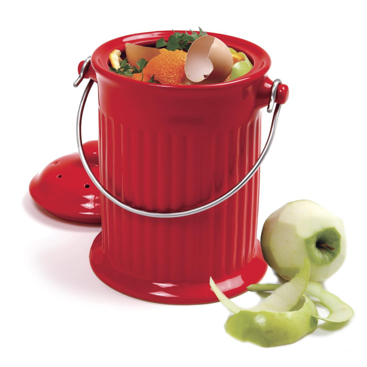 Product description: Store vegetable peelings, coffee grounds, eggshells, greens and other food scraps until you have time to deposit them into your outdoor compost. Two charcoal filters in the vented lid control odors. Ceramic with stainless-steel carrying handle. Hand wash. 1-gal. 7" Dia. x 11"H.
