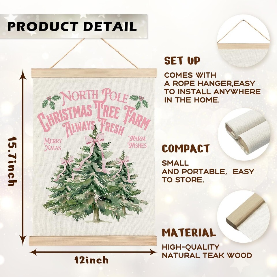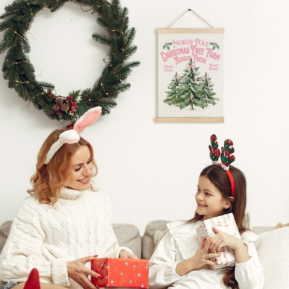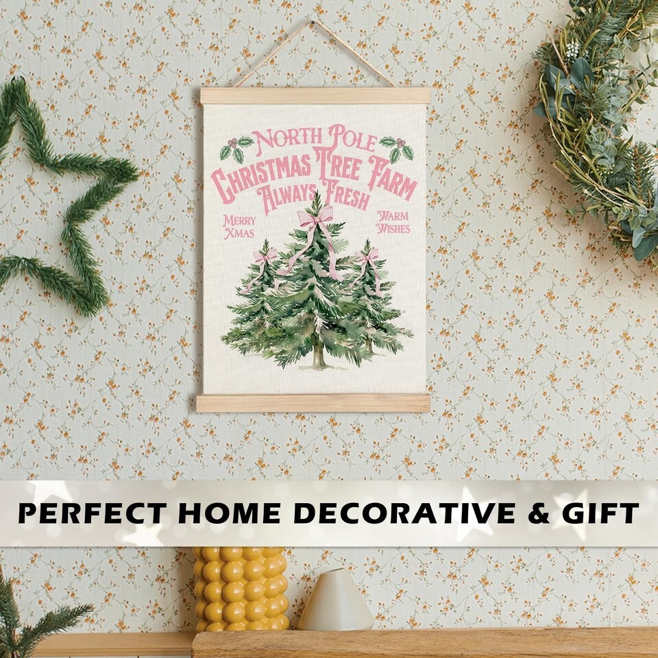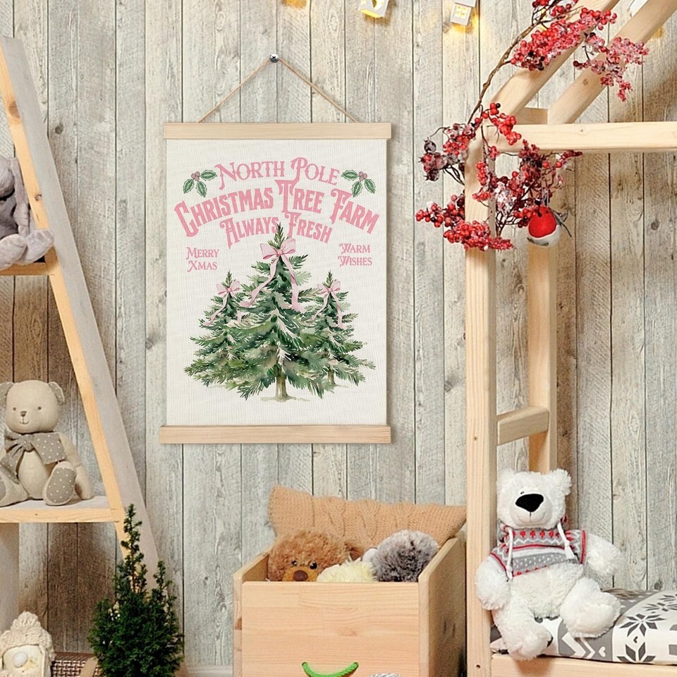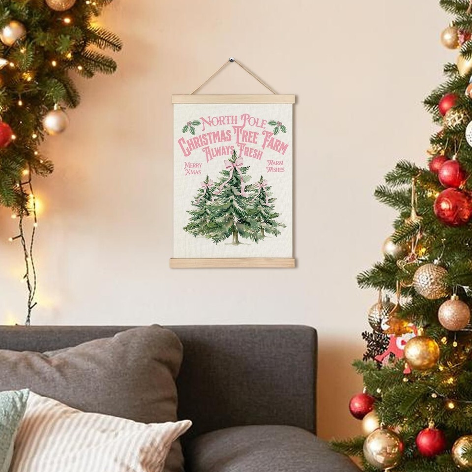 - North Pole Village Christmas Wall Decor Pink Bows 12x16 Inch Farmhouse Art