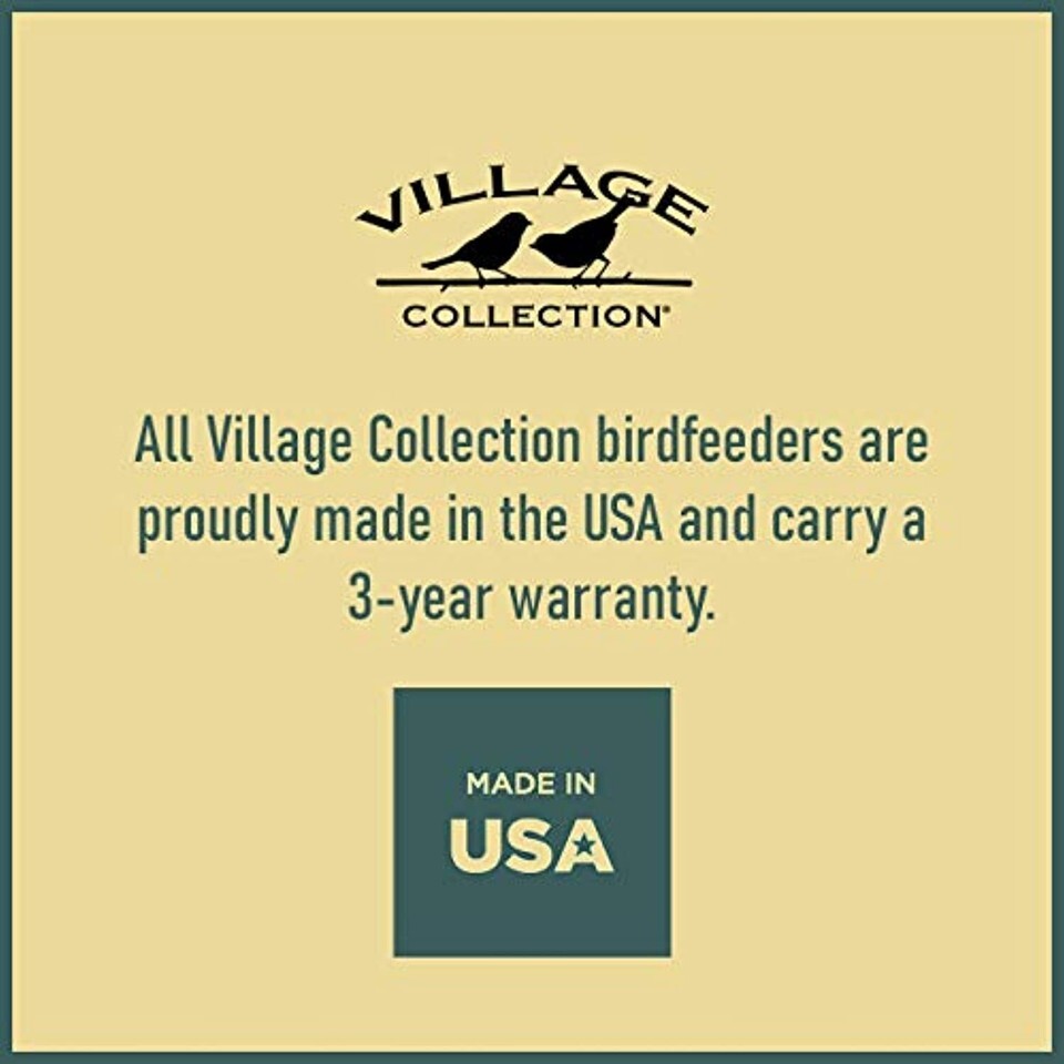 PROUDLY MADE IN THE USA: Village Collection Birdfeeders are made from durable, UV protected, weather-resistant plastic and include a 3-year warranty. DIMENSIONS: 9.5" x 10.25" x 13.25" high.