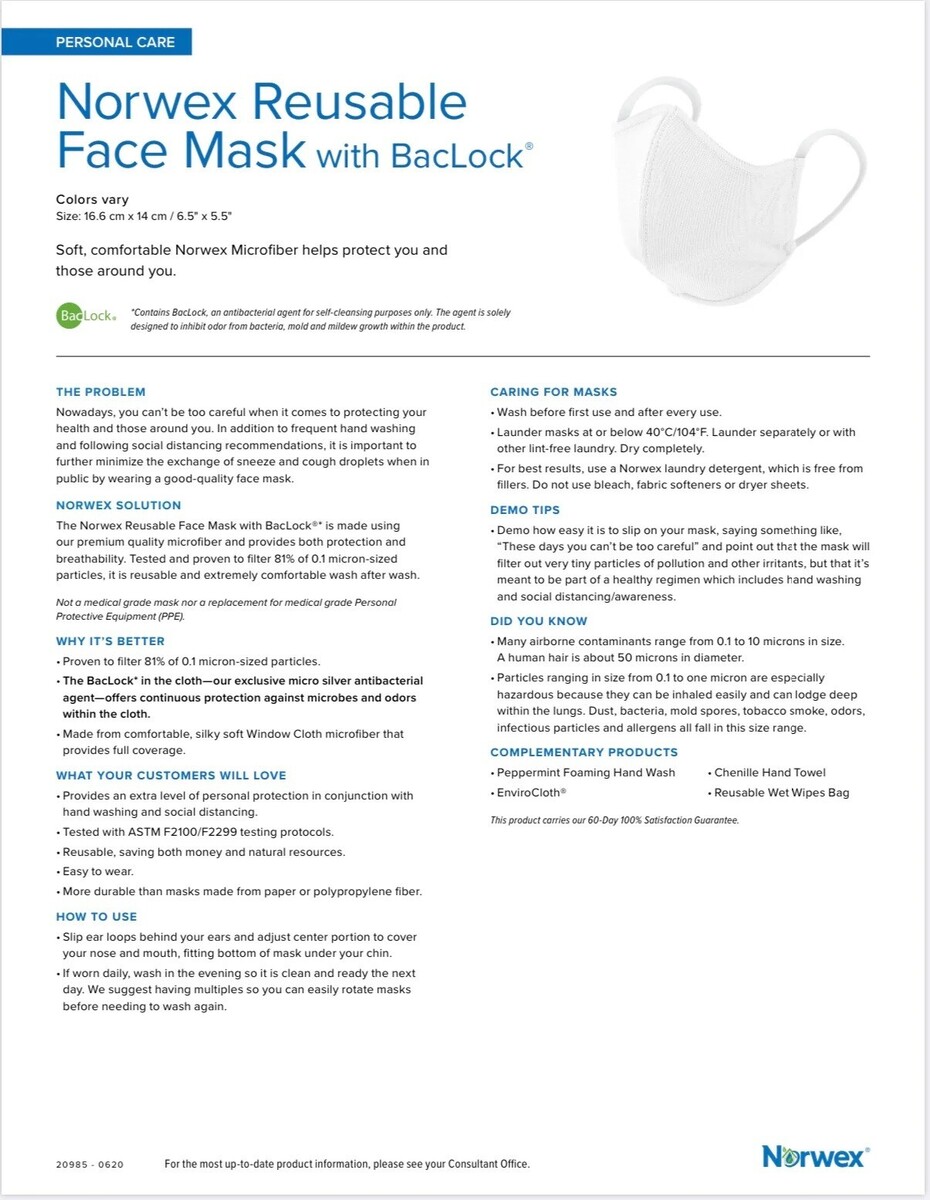 The Norwex Reusable Face Mask with BacLock is made using our premium quality microfiber and provides both protection and breathability. Tested and proven to filter 81% of 0.1 micron-sized particles, it is reusable and extremely comfortable wash after wash.