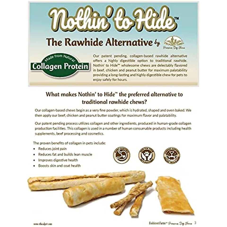 Fieldcrest Farms Nothin' to Hide chews are are highly digestible alternative to rawhide. Available in a wide range of sizes and shapes, our delectable beef coated chews are sure to offer a safe, flavorful chewing experience for your pets 96% digestible. Available in shapes and sizes for all breeds Chewing helps satisfy your pets natural desire to chew. Chewing also promotes strong teeth and healthy gums Easily Digestible for safe and reliable enjoyment