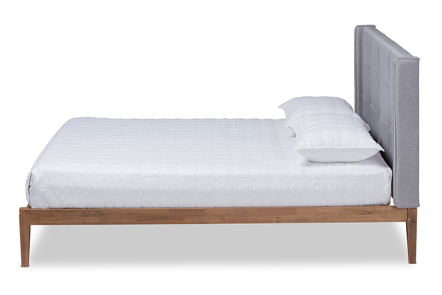 Enjoy relaxed mornings and nights in the modern Nura bed. Its large, foam padded headboard is upholstered in Grayfabric and enhanced with elegant button tufting. Made in Malaysia, the bed is supported by sturdy wood legs, allowing for ample storage space underneath the platform. Assembly is required and a box spring isnt necessary, as the Nura comes with internal slats for mattress support. Ash walnut finished wood complements the clean, streamlined design of the frame, giving the whole bedroom a pleasant and contemporary feel.