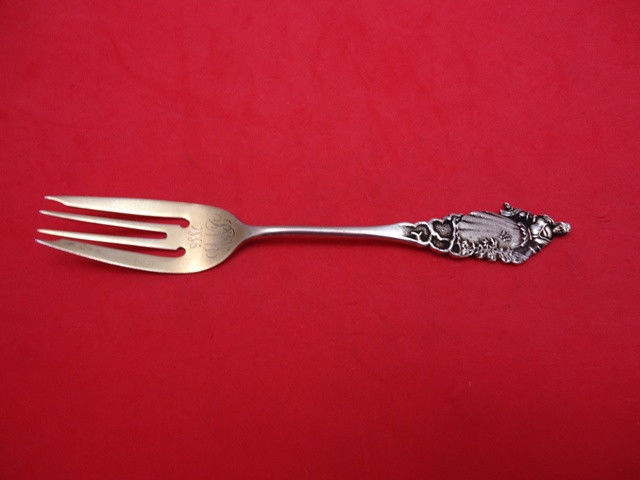 Sterling silver SALAD FORK 5 7/8" GOLD WASHED LADY W/BUTTERFLY DATED 1886 in the pattern Nuremberg by Gorham. It is monogrammed (monos vary) and is in excellent condition.