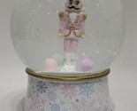 Classic Nutcracker Design: A central pink and gold-toned nutcracker figure stands inside the globe, complete with a crown and detailed uniform.